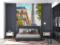 Transform your interior into a chic Parisian escape with this captivating wallpaper for walls. This design showcases a unique perspective of the Eiffel Tower rising above charming buildings and vibrant trees. The neutral tones accented with touches of blue and green offer a versatile palette, blending seamlessly with various décor styles. Perfect for creating an inviting ambiance in your living room, dining room, or home office, this design elevates your space with a sophisticated travel theme. It introduces subtle texture and depth, enhancing the visual appeal of your walls.