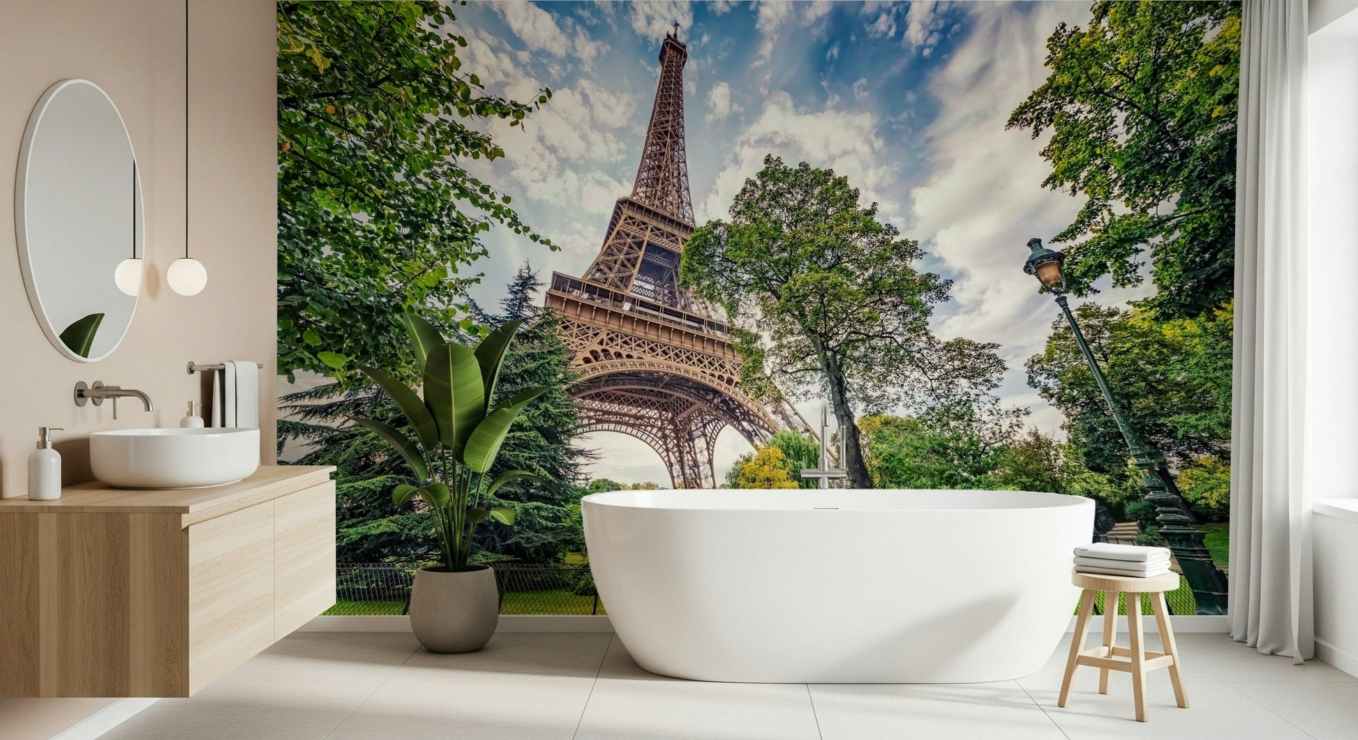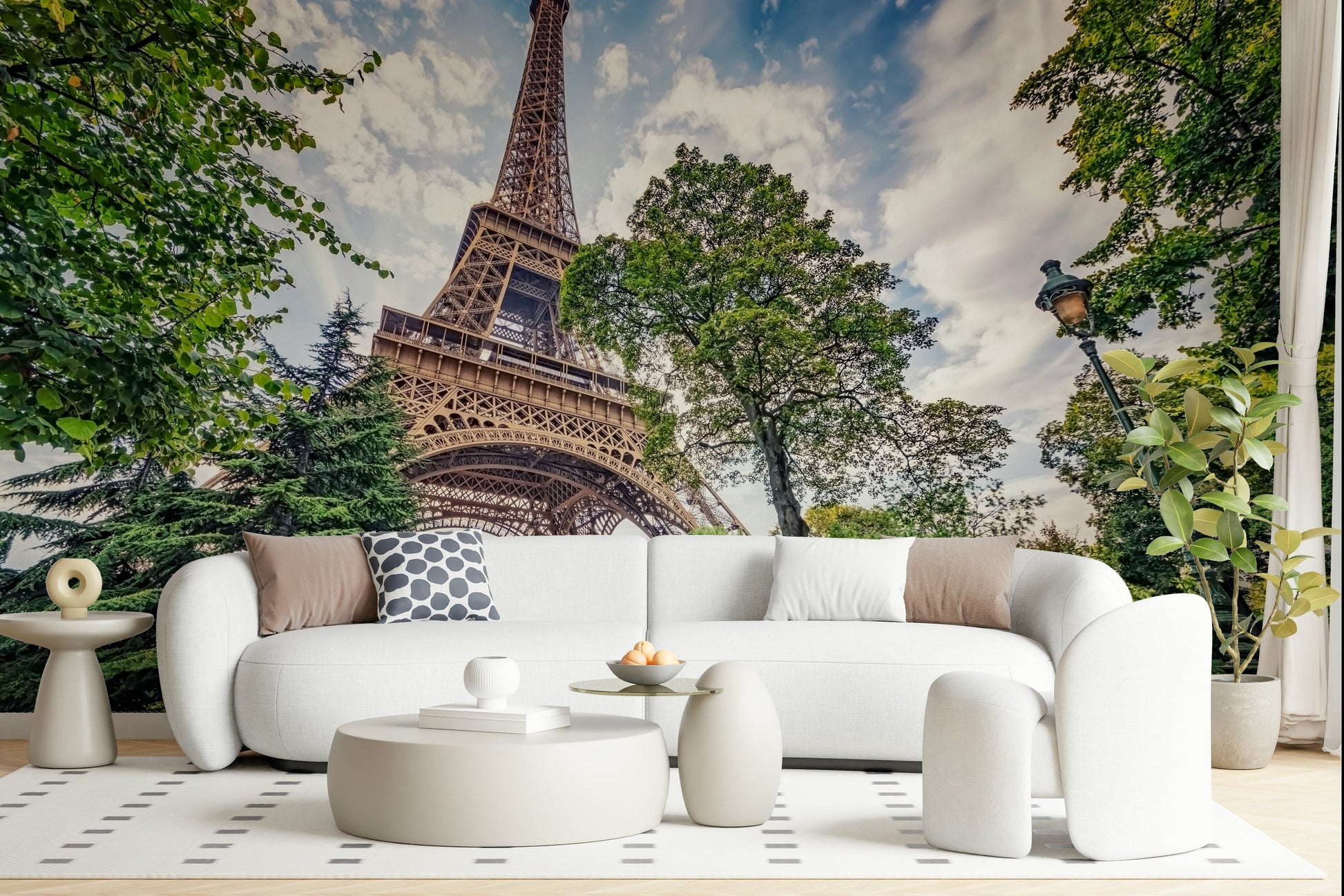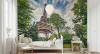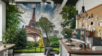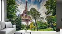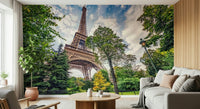 Elevate your home décor with this scenic view of the Eiffel Tower framed by vibrant trees. This wallpaper for walls features a balanced colour palette of soft greens, sky blues, and warm browns. This creates a peaceful ambience that enhances any room. Perfect for a living room or dining area, this design brings a sense of wanderlust to your space. Its detailed composition and natural tones also work well in a bedroom or office, encouraging relaxation and focus. Let this iconic Parisian landmark transform your walls into a stunning vista.
