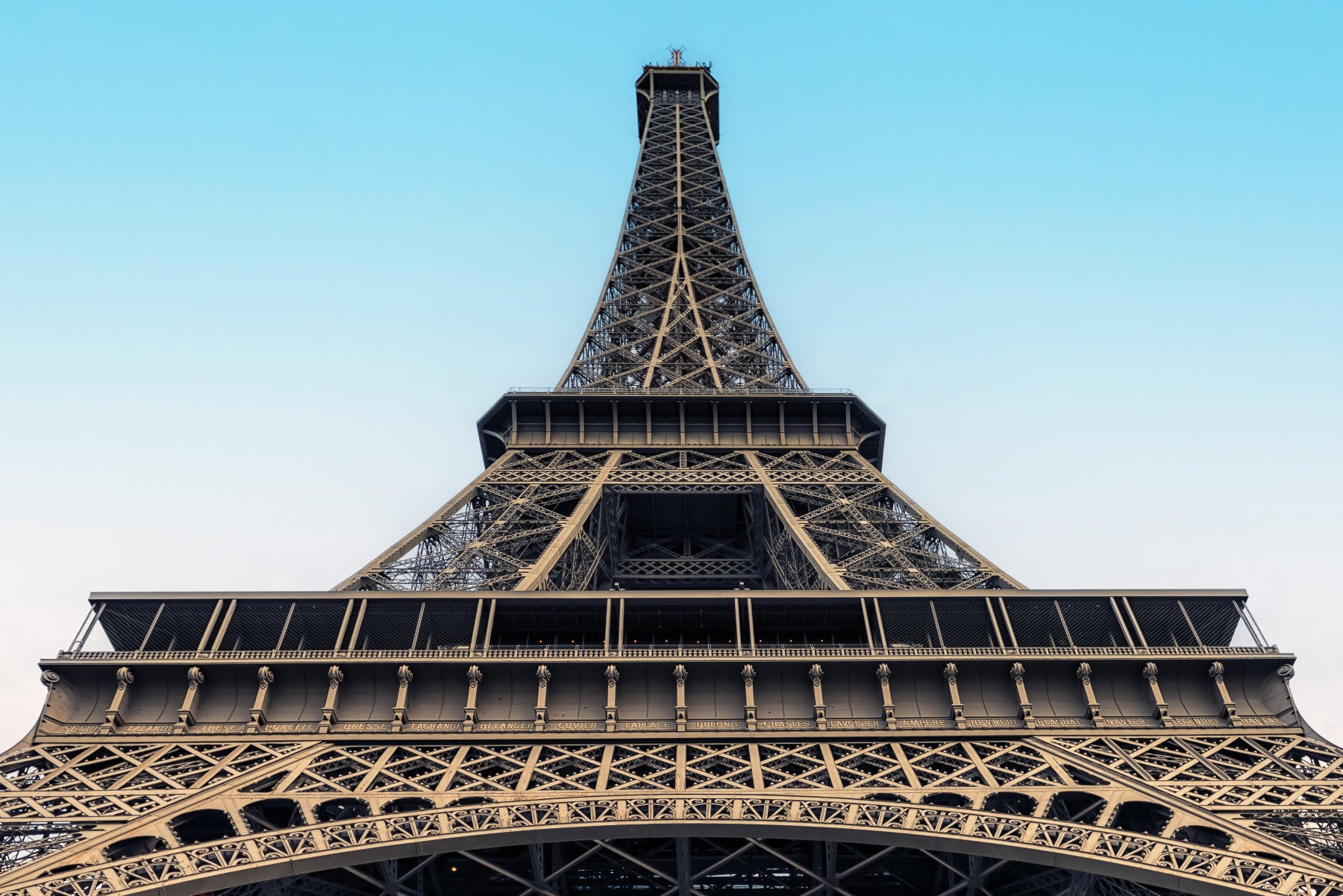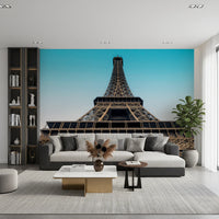 Elevate your interiors with the 'Eiffel's Azure Ascent' wallpaper for walls. This striking design showcases the Eiffel Tower reaching towards a clear, tranquil sky, bringing a sense of height and open space to any room. The metallic details of the tower contrast beautifully with the soft blue background, making it a perfect choice for creating a sophisticated atmosphere in hallways, dining rooms, or home libraries. This wallpaper adds a touch of European charm and architectural interest to your décor.