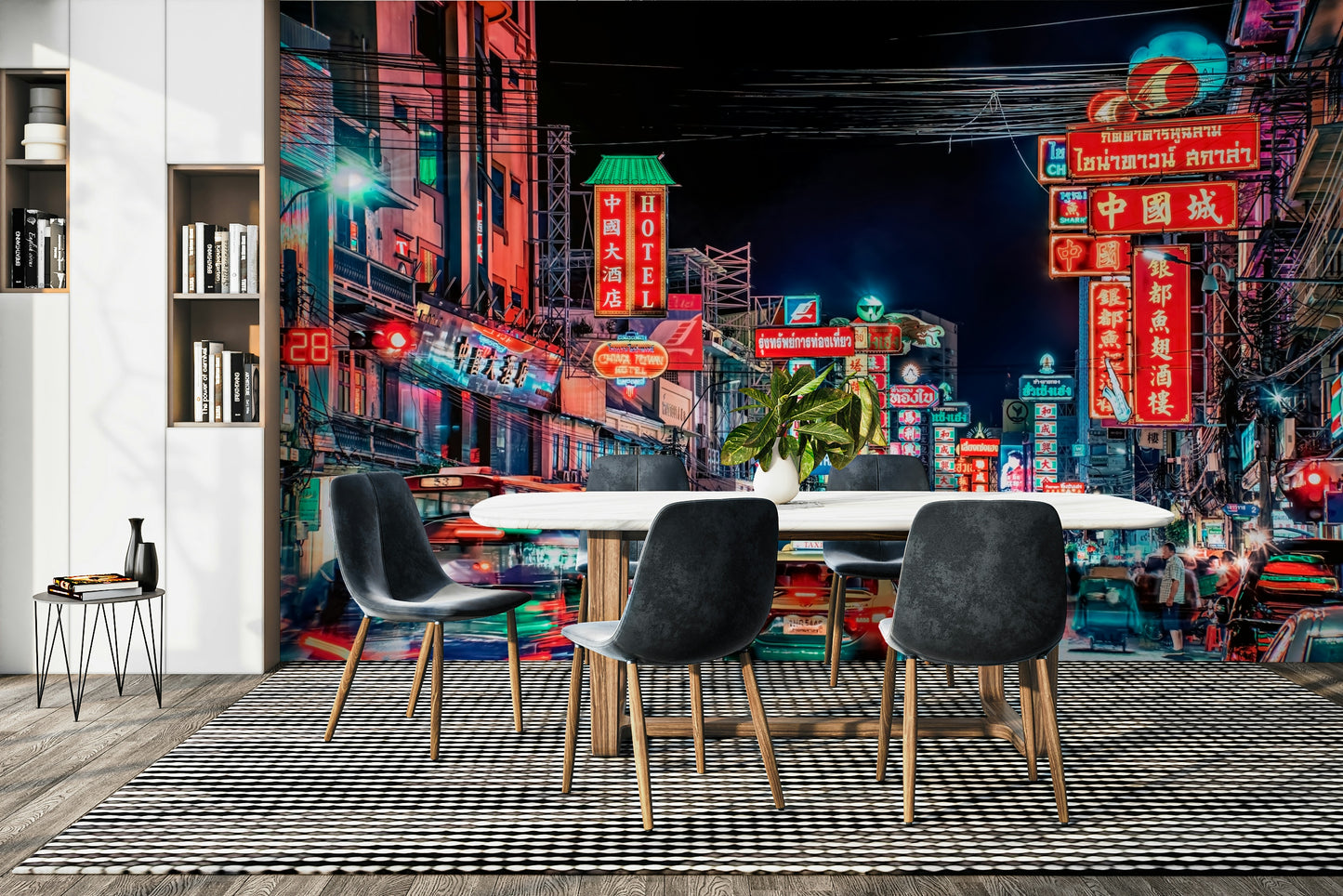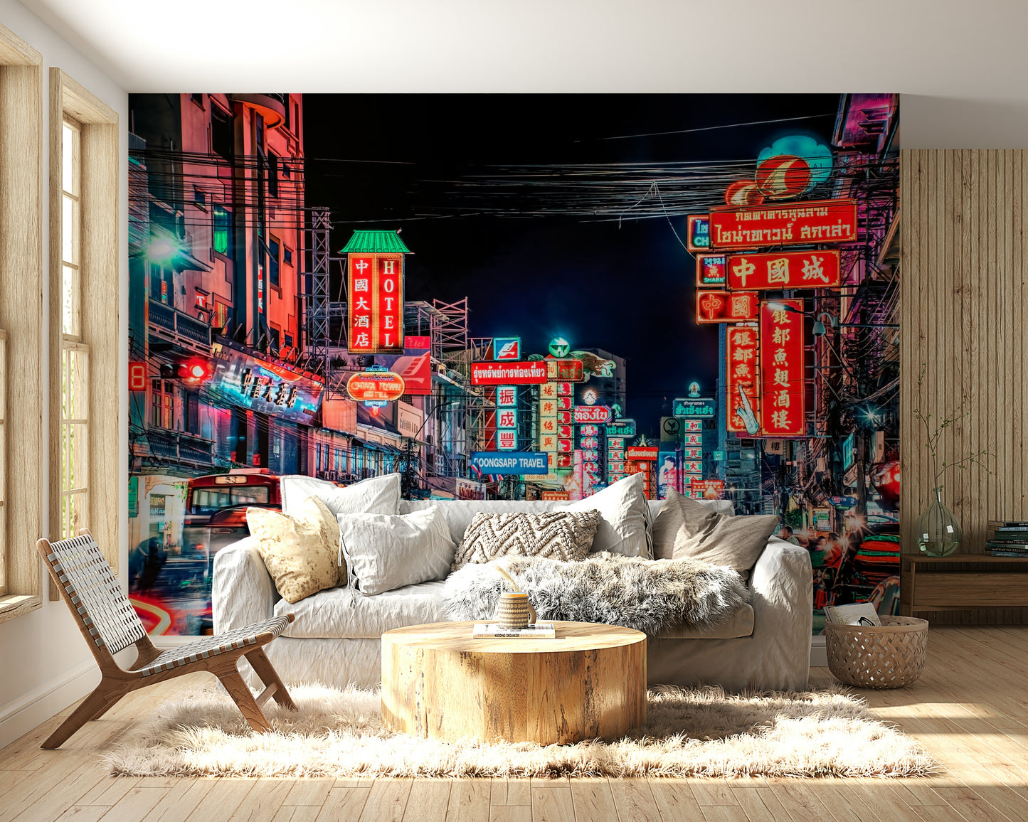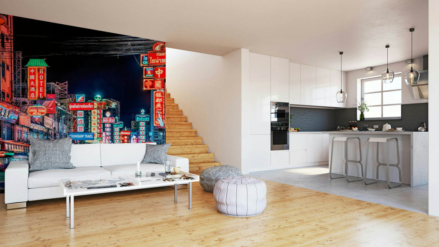 Experience the electrifying pulse of Bangkok's street life with this captivating wallpaper. The image showcases a vibrant street at night, awash in a dazzling array of neon signs in various languages, creating a kaleidoscope of color and light. Motion blur captures the energy of moving vehicles and pedestrians, adding dynamism to the scene. The rich interplay of warm and cool tones creates a mesmerizing effect, inviting viewers to immerse themselves in the city's unique atmosphere. This stunning visual is perfect for those seeking to inject a vibrant, cosmopolitan feel into their living spaces.