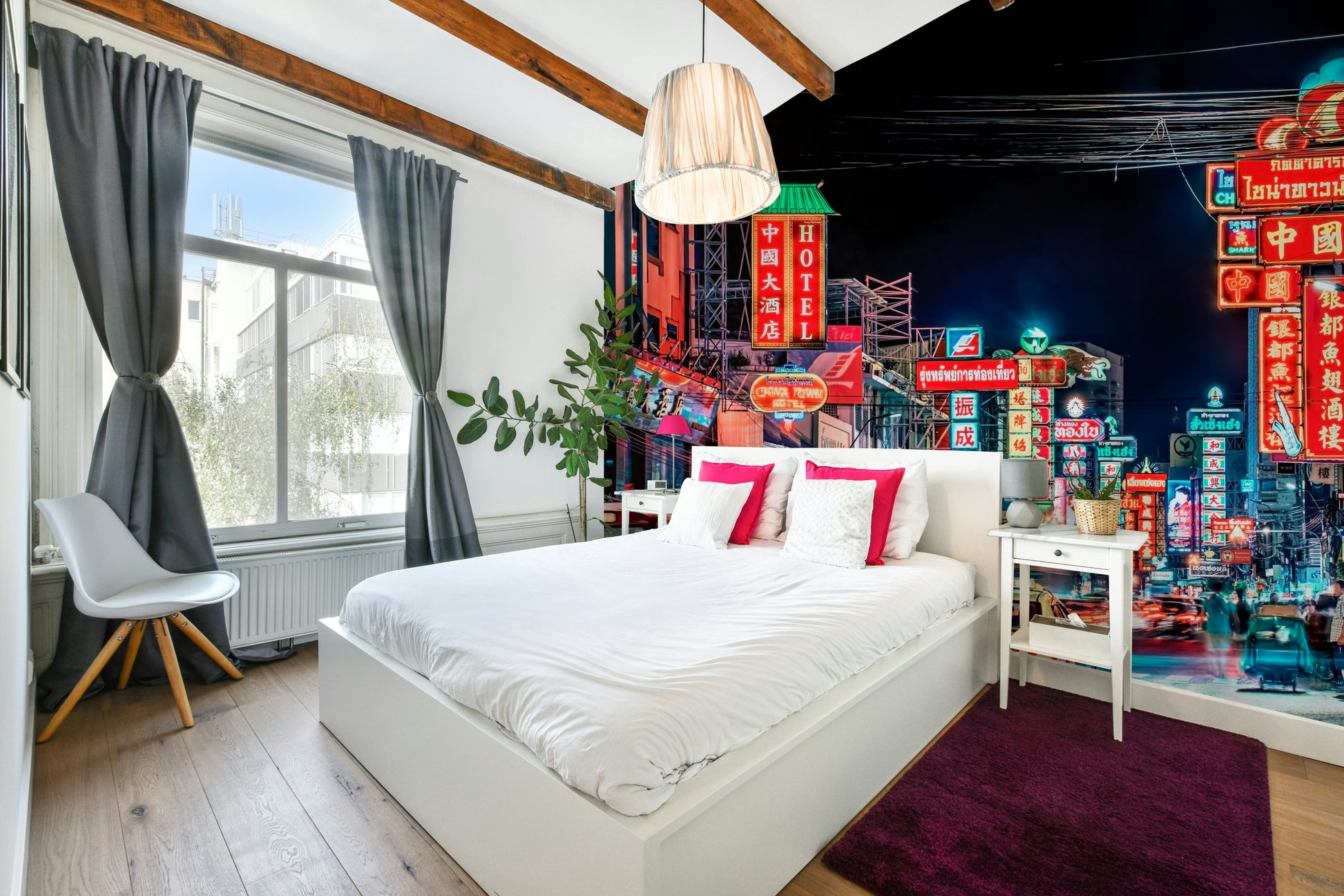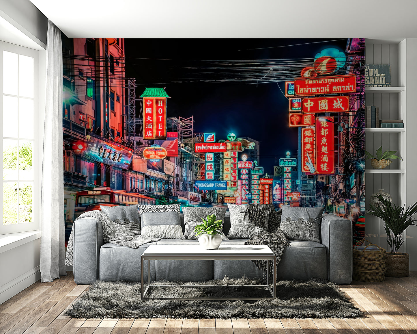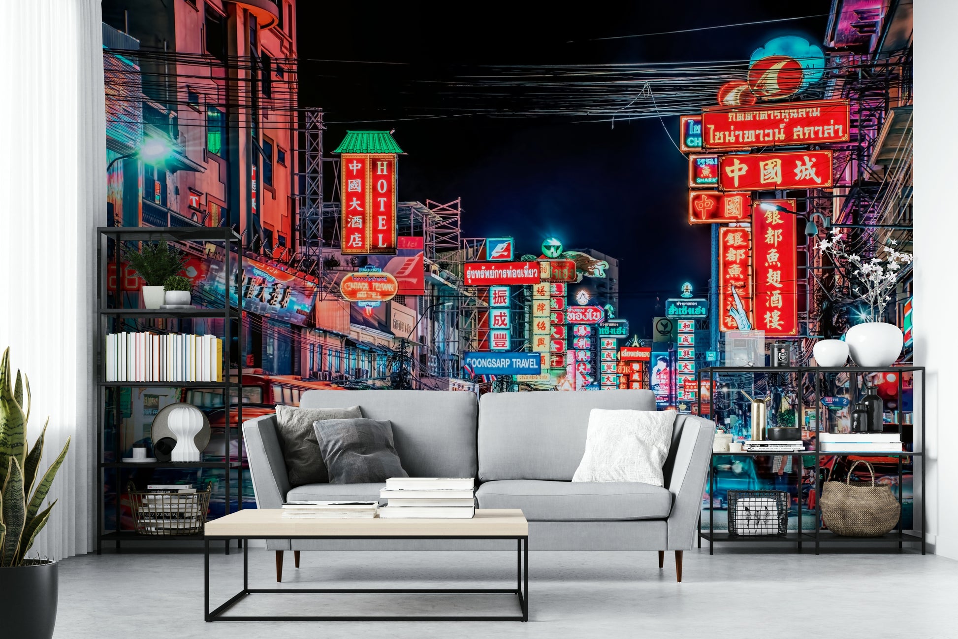 Experience the electrifying pulse of Bangkok's street life with this captivating wallpaper. The image showcases a vibrant street at night, awash in a dazzling array of neon signs in various languages, creating a kaleidoscope of color and light. Motion blur captures the energy of moving vehicles and pedestrians, adding dynamism to the scene. The rich interplay of warm and cool tones creates a mesmerizing effect, inviting viewers to immerse themselves in the city's unique atmosphere. This stunning visual is perfect for those seeking to inject a vibrant, cosmopolitan feel into their living spaces.