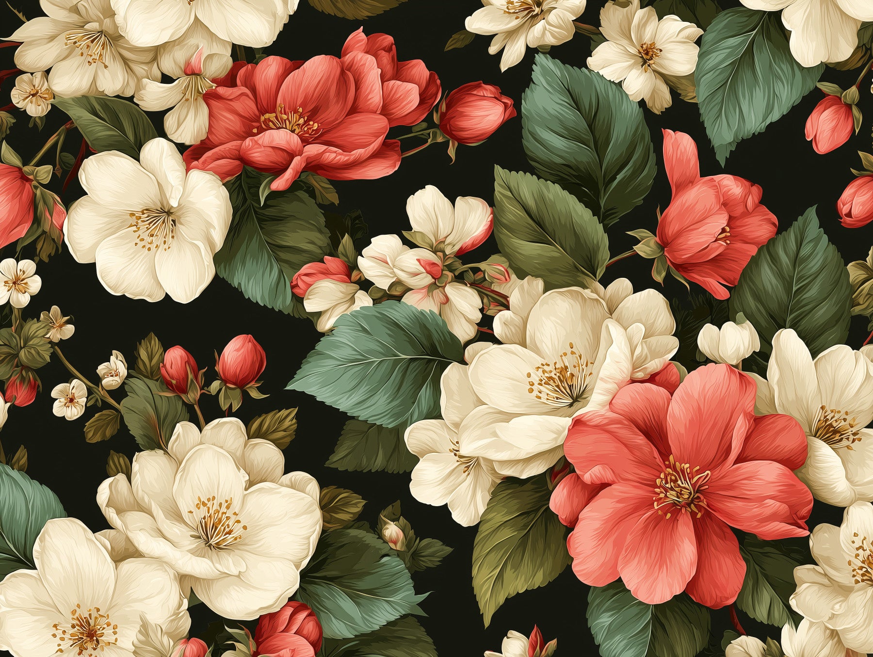 Transform your space with this elegant floral wallpaper for walls. The design features large red and cream flowers with green foliage against a dark background. The seamless pattern ensures a stunning impact in any room. Use it to create a luxurious bedroom, a sophisticated living room, or a charming dining area. It's a fantastic way to introduce a touch of floral elegance to your home. This design complements interiors with a classic or modern style. It works very well in rooms with neutral colours.