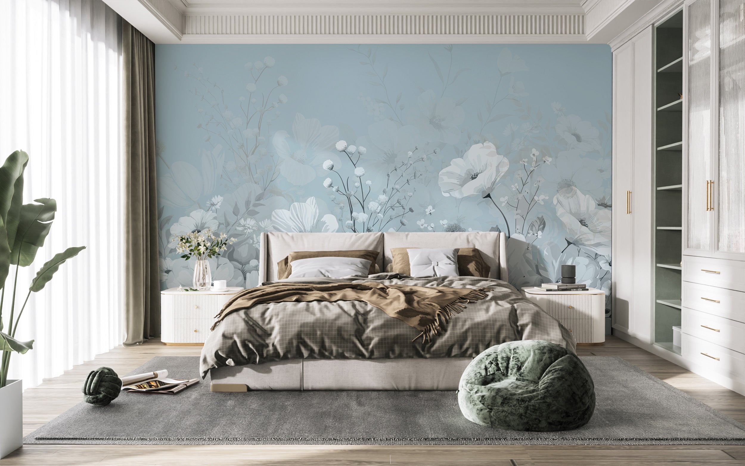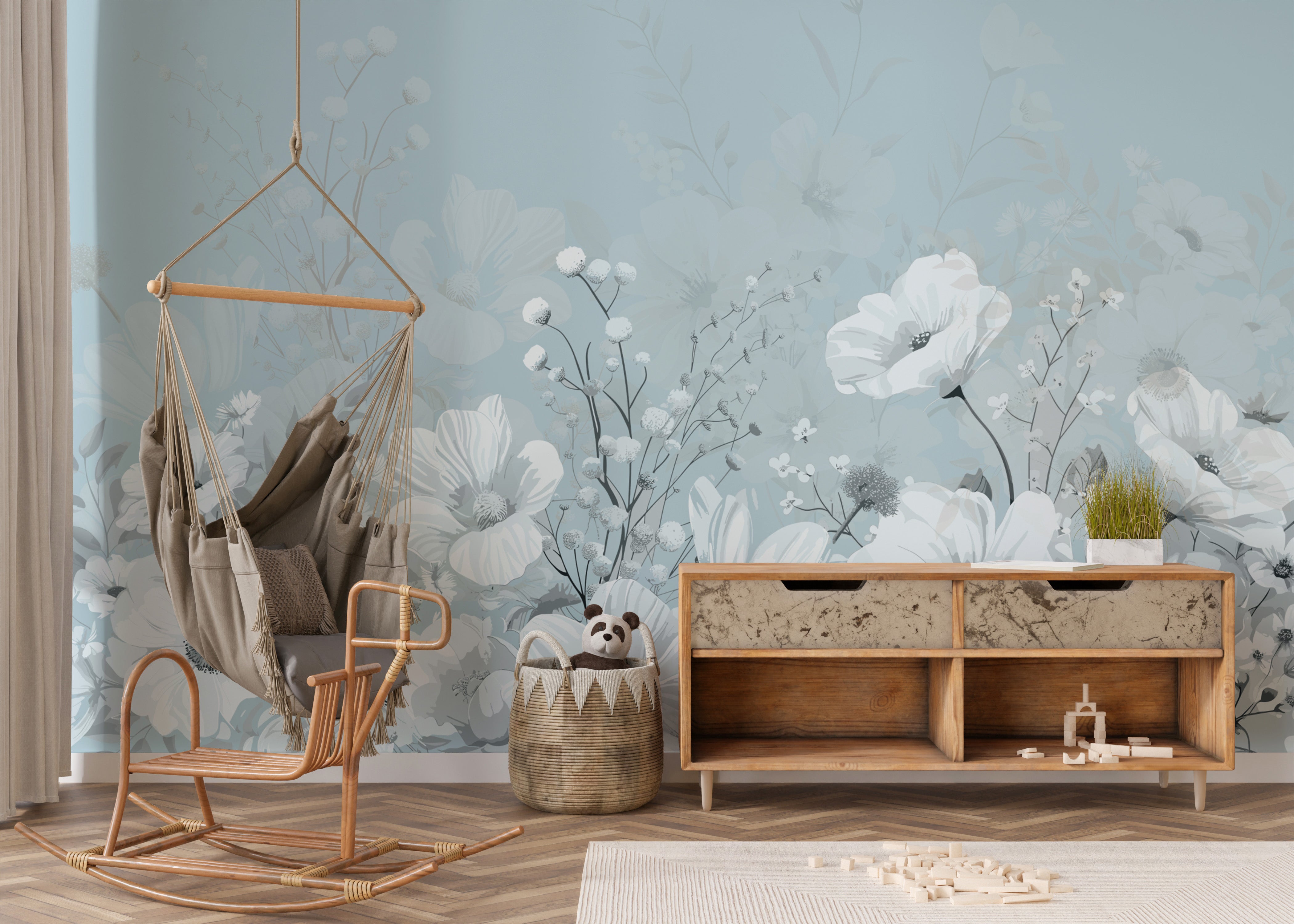 Soft Blue Floral Wallpaper Mural with Vintage Charm