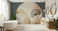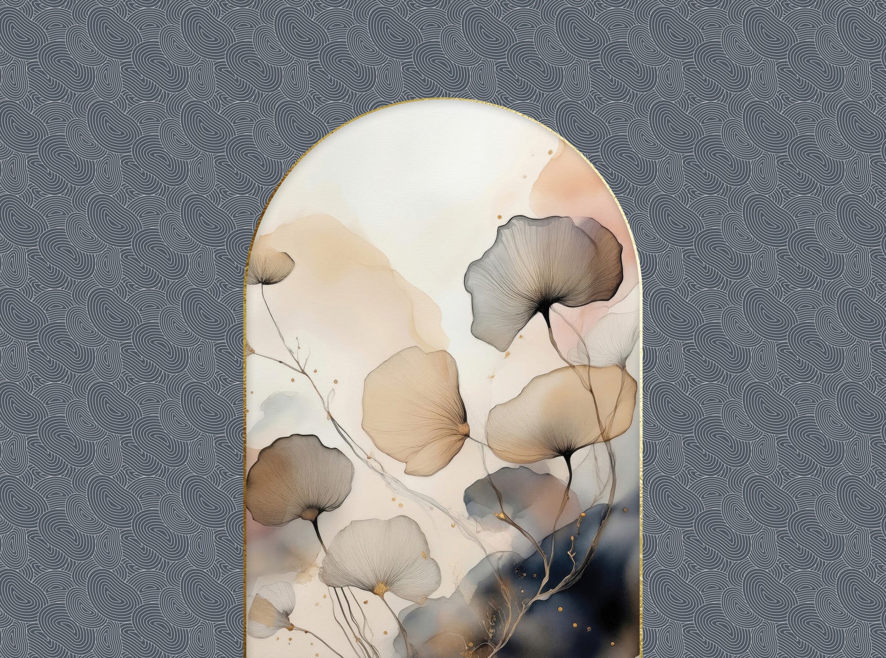 Invite a touch of refined nature into your home with this wallpaper design. It blends soft floral elements with a structured geometric motif. The design shows delicate flowers in shades of beige and grey. These appear within a golden arched frame. A swirling line pattern on a muted blue backdrop creates depth. This wallpaper for walls enhances bedrooms with a serene feel. It also makes hallways more welcoming, and enriches living rooms with subtle texture. The elegant hues ensure a flexible complement to diverse interiors.