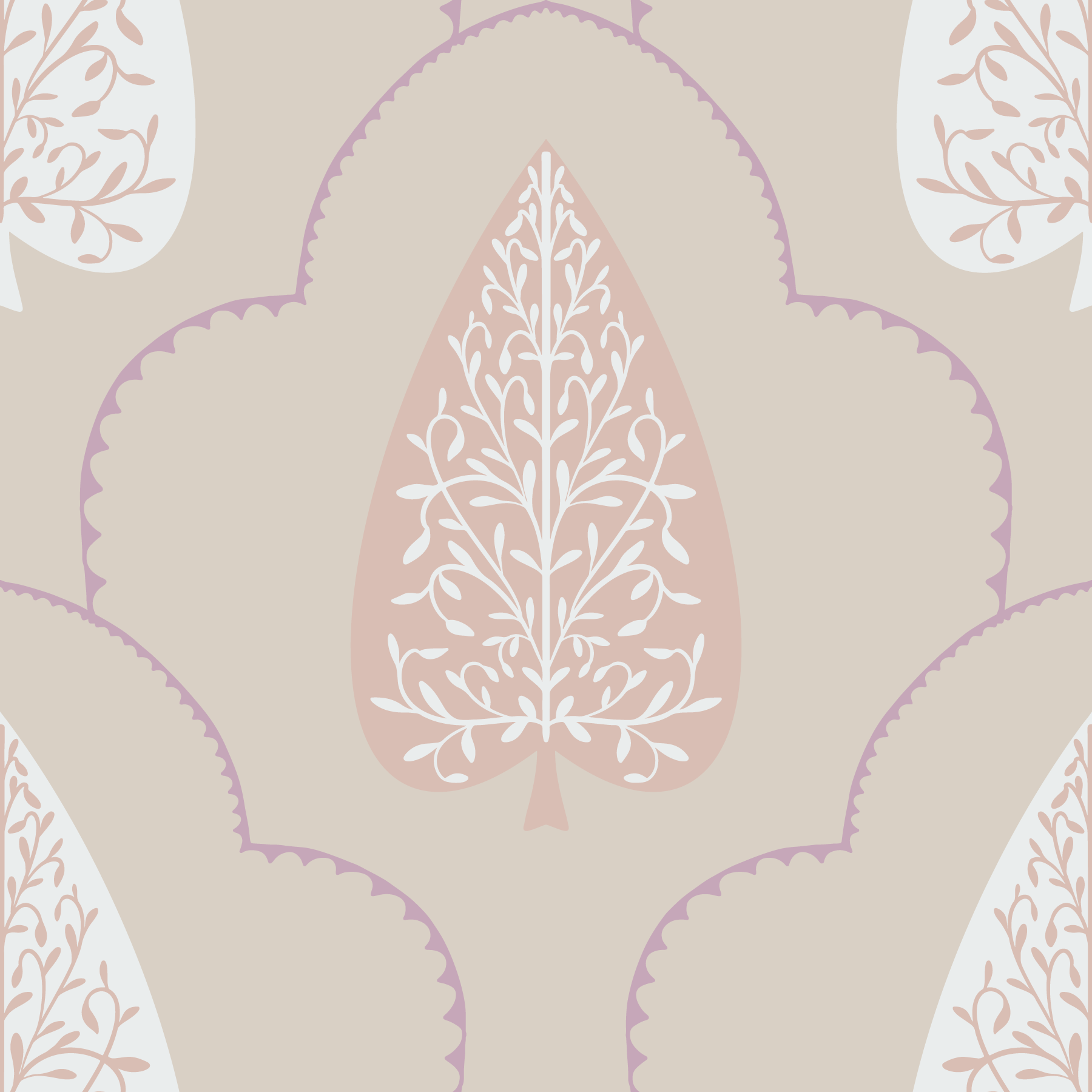 Bring a touch of understated grace to your home with this foliage wallpaper. It features a repeating pattern of stylized leaves and a scalloped border in blush and cream tones. The pattern creates a calm and refined atmosphere. This wallpaper for walls works wonders in bedrooms, living rooms, or hallways. Its soft palette and classic design also enhance meditation spaces.