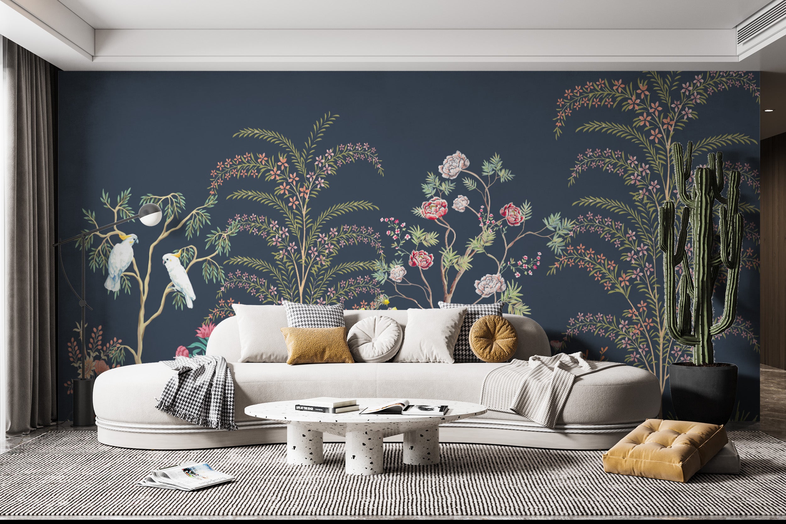 Elegant peacock chinoiserie wallpaper brings a sophisticated touch with intricate botanical details and exotic birds. The dark blue exotic bird wallpaper features peacocks, cockatoos, and delicate floral patterns, creating a timeless nature-inspired setting. Rich colors and hand-painted elements make this luxury botanical chinoiserie wallpaper ideal for bedrooms, dining areas, or feature walls. The vintage floral designs complement both modern and classic interiors. The peacock and cockatoo mural enhances the beauty of any setting with its refined aesthetic. The chinoiserie wallpaper floral bird design adds depth and elegance, offering a captivating statement piece with intricate natural elements.