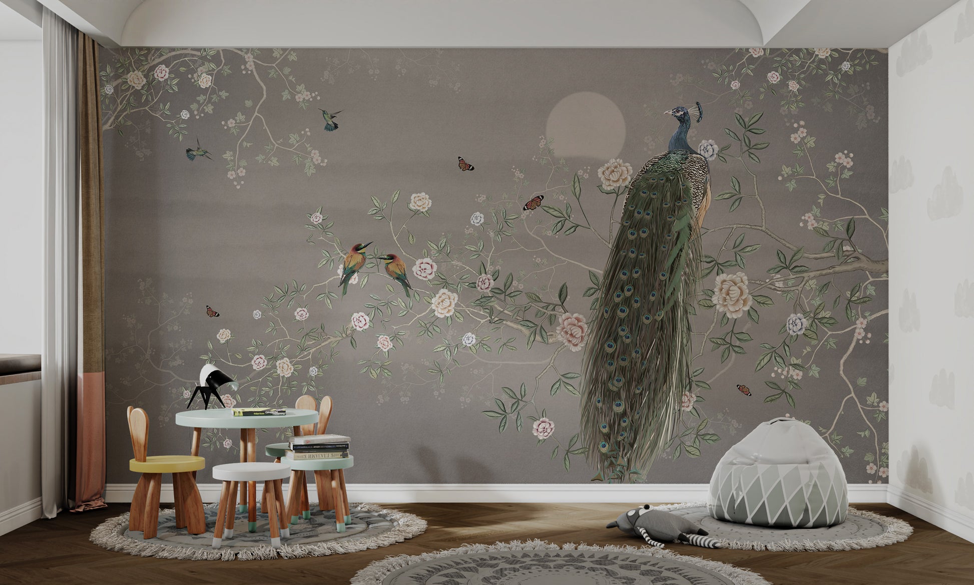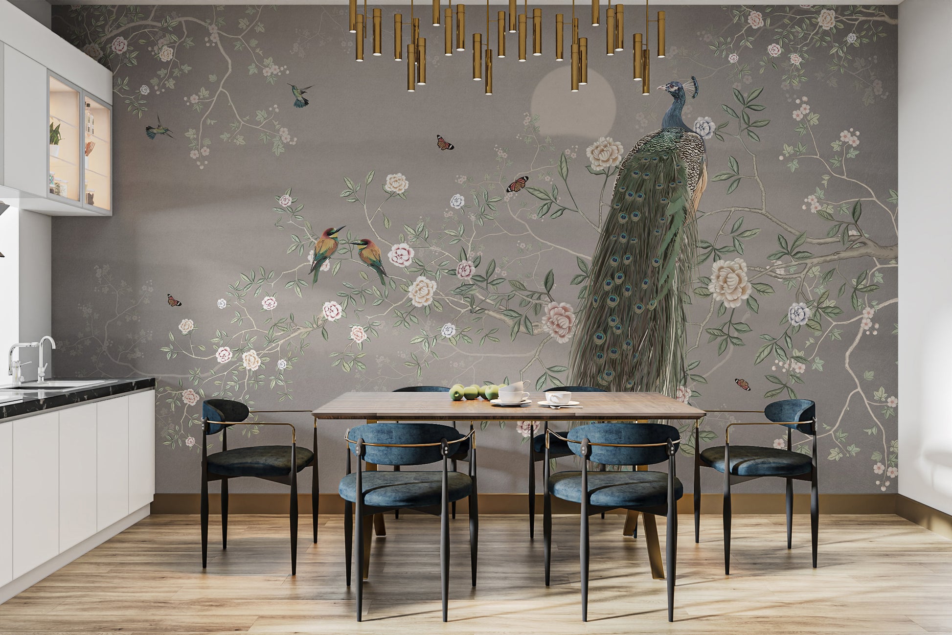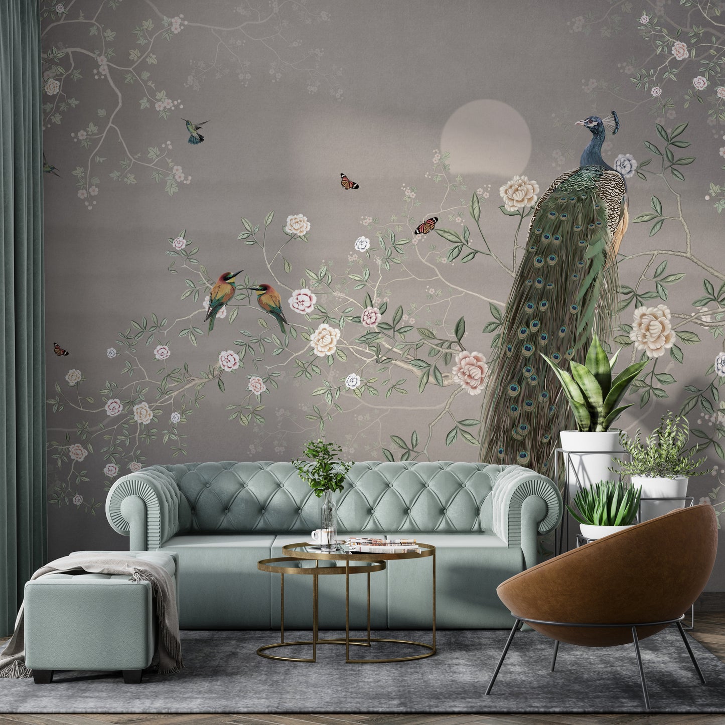 Transform your space with the elegant peacock chinoiserie mural wallpaper, a timeless fusion of peacock wallpaper mural and vintage floral wallpaper. This exquisite design features a majestic peacock perched on delicate branches, surrounded by soft-hued blossoms and fluttering butterflies. Inspired by luxury chinoiserie-style decor, this mural adds an air of sophistication to any interior. The muted gray backdrop enhances the intricate details, making it a perfect choice for creating a serene ambiance. Ideal for living rooms, bedrooms, or feature walls, this botanical wallpaper mural blends elegance with nature. Elevate your décor with this hand-painted peacock mural today!