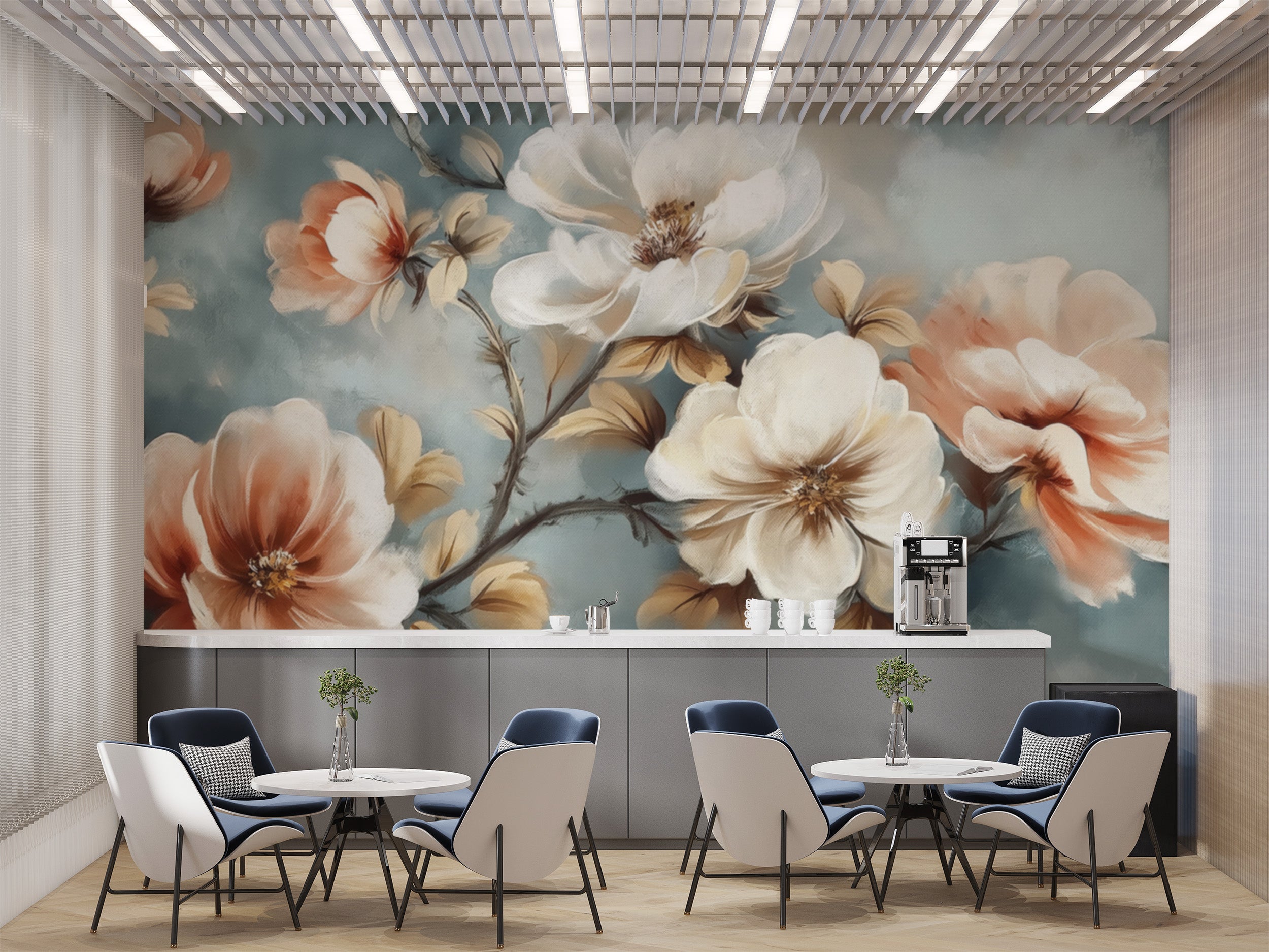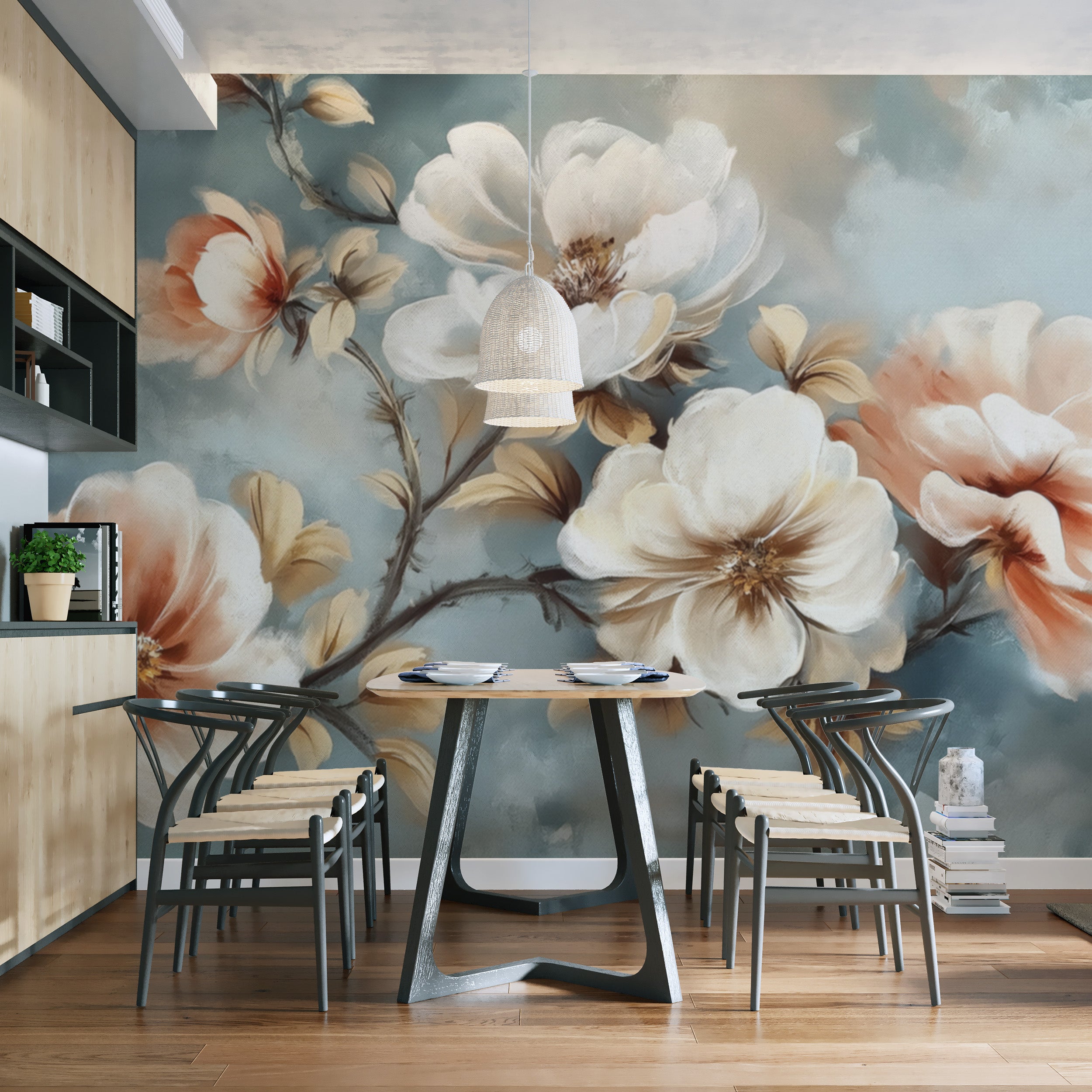 Soft brushstrokes bring this watercolor floral wallpaper mural to life, featuring delicate blooms in warm peach and ivory tones against a muted blue backdrop. The hand-painted effect enhances the vintage flower mural, making it a timeless choice for bedrooms, living rooms, or accent walls. The subtle contrast between the floral elements and background adds depth and sophistication. Crafted with high-quality materials, this luxury flower wallpaper offers durability and a seamless finish. The intricate floral details create a captivating focal point, while the soft hues complement various interior styles. Refresh interiors with this classic floral pattern wallpaper for a refined look.