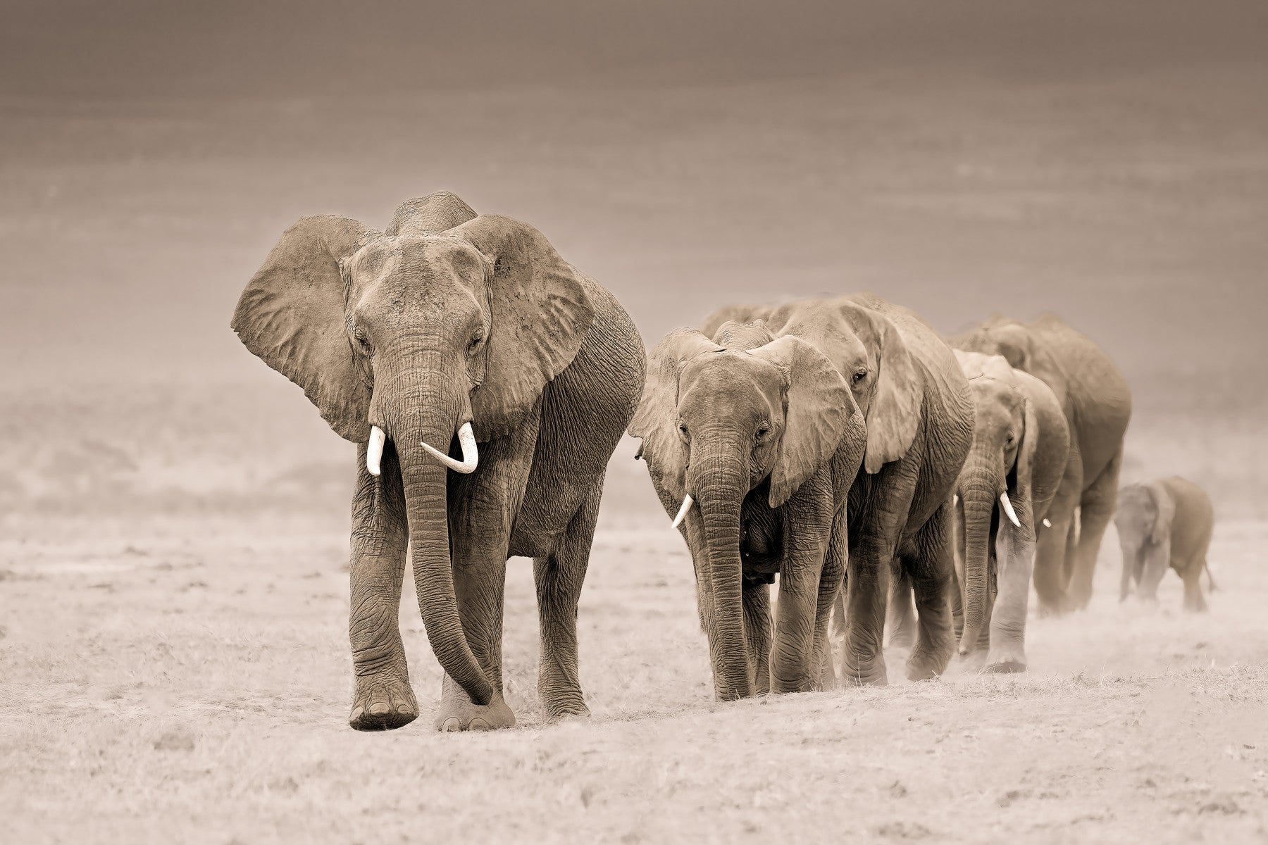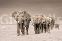 A majestic herd of elephants strides across the savanna in this sepia-toned image. The texture of their skin and tusks are captured in rich detail. Display this wallpaper for walls in living rooms or offices to add an element of the wild. The monochromatic scheme gives it a timeless feel that elevates classic and modern spaces. The design complements interiors with its focus on natural form and organic textures. Introduce a touch of Africa into your space.