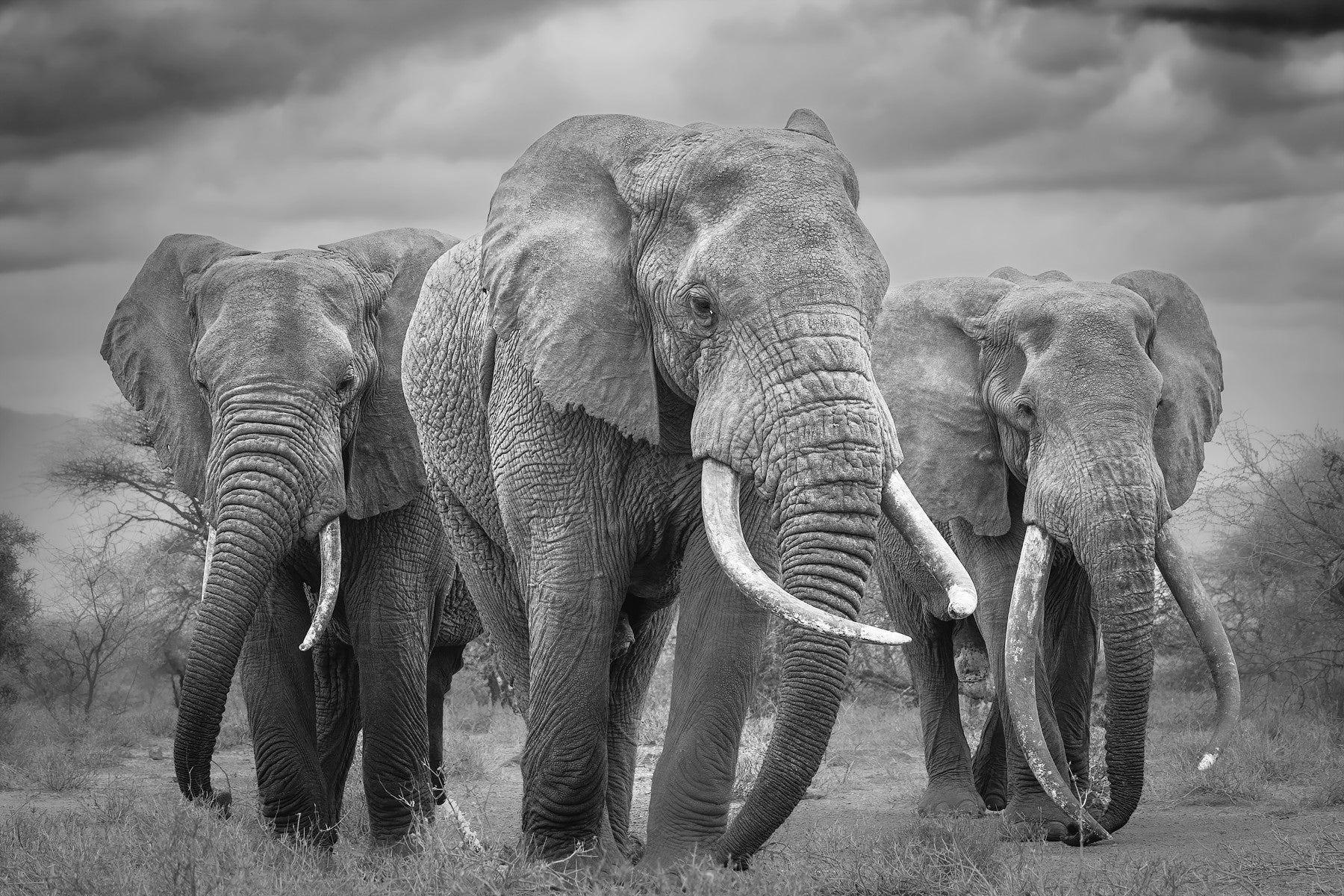 Witness the profound presence of nature's giants in "Elephant Majesty." This striking black and white wallpaper captures the stoic power and regal bearing of three African elephants. The image showcases the magnificent creatures in their natural habitat, under a dramatic, cloud-strewn sky, creating a scene of timeless beauty. The intricate details of their textured skin and impressive tusks are rendered with stunning clarity, emphasising their age, wisdom, and enduring strength. More than just a picture, it's a portrait of raw, untamed grace. Bring a touch of the wild, the quiet grandeur of the African savanna, and the awe-inspiring essence of elephantine majesty into your digital space.