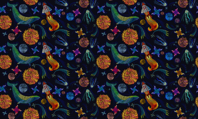 Bring the cosmos to your nursery with our interstellar whales embroidery universe mural wallpaper. This vibrant and colourful pattern blends playful elements of space exploration with whimsical marine life, featuring rockets, diverse planets, and celestial whales. The rich, dreamlike design captivates the imagination, making it an enchanting backdrop for storytelling and play. The repeating pattern ensures continuity, which is perfect for large-scale applications. So why not elevate your little astronomer's room with this star-studded nursery wallpaper? Discover a universe of wonder right in your home!