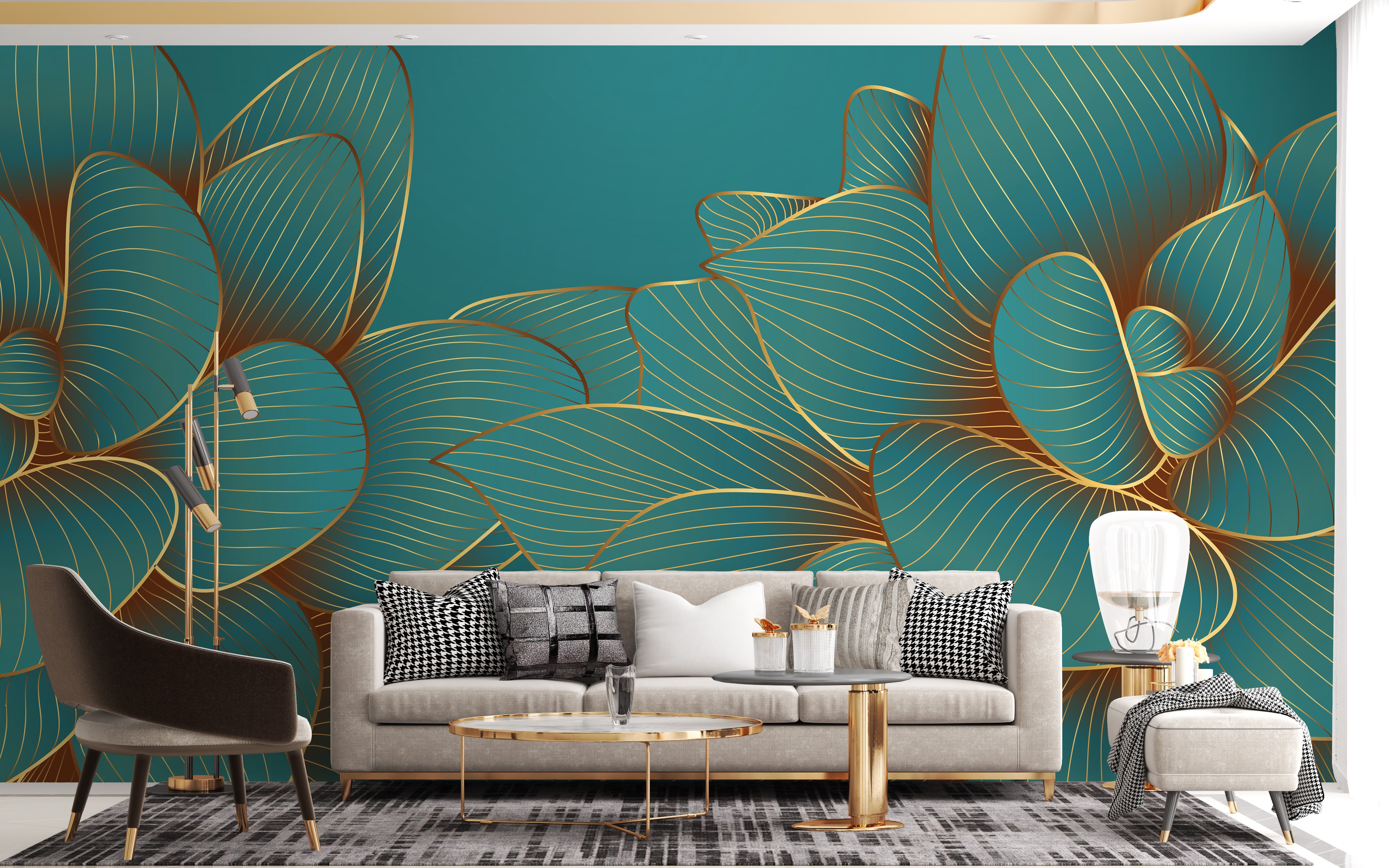 Delicate and striking, the gold emerald lotus floral mural wallpaper is perfect for adding elegance to your living room. The lavish design features blooming lotus flowers in a symmetrical pattern, painted in vibrant shades of gold and emerald, making it a statement piece. Not only does it enhance the appearance of a room, but it also reflects the refined taste of its owner. This flower wallpaper blends seamlessly with any furniture and decor and is perfect for those who want to express their creativity and personality in their homes.