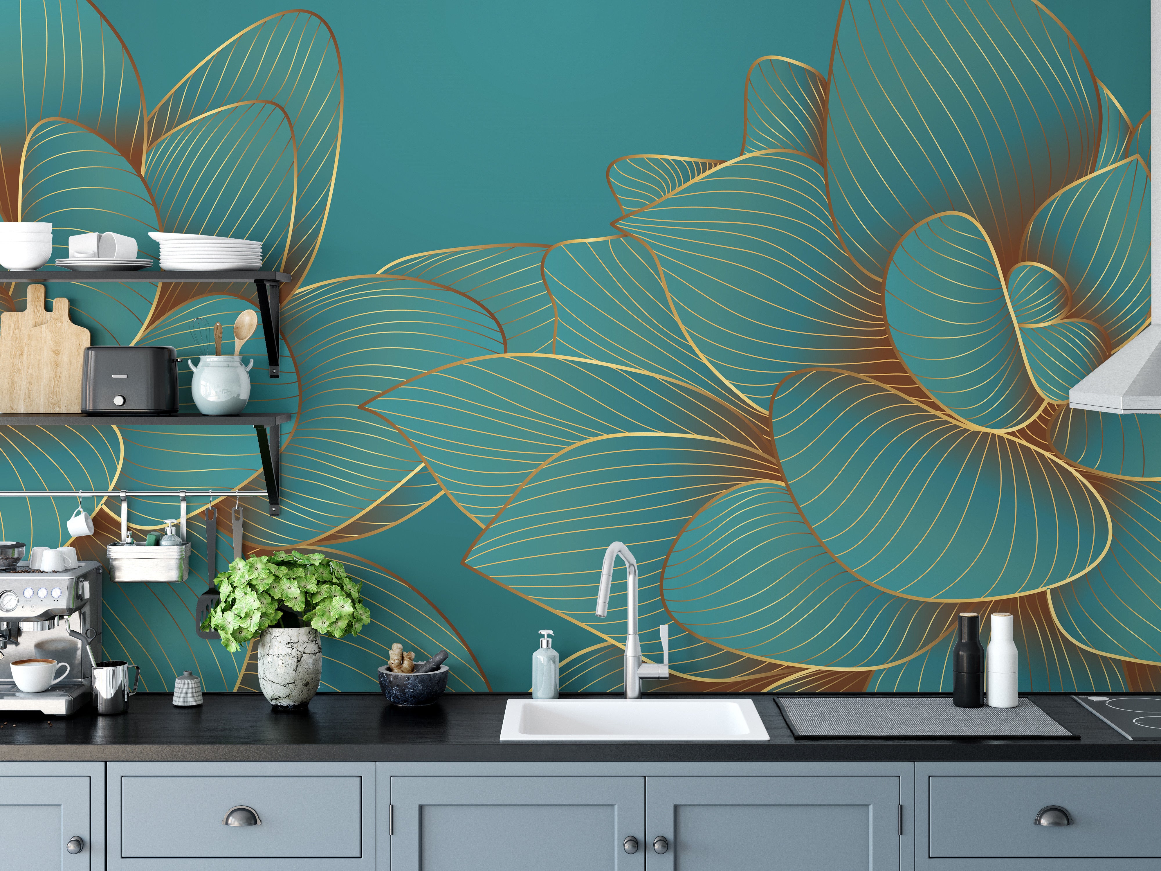 Stylish emerald lotus mural with golden charm