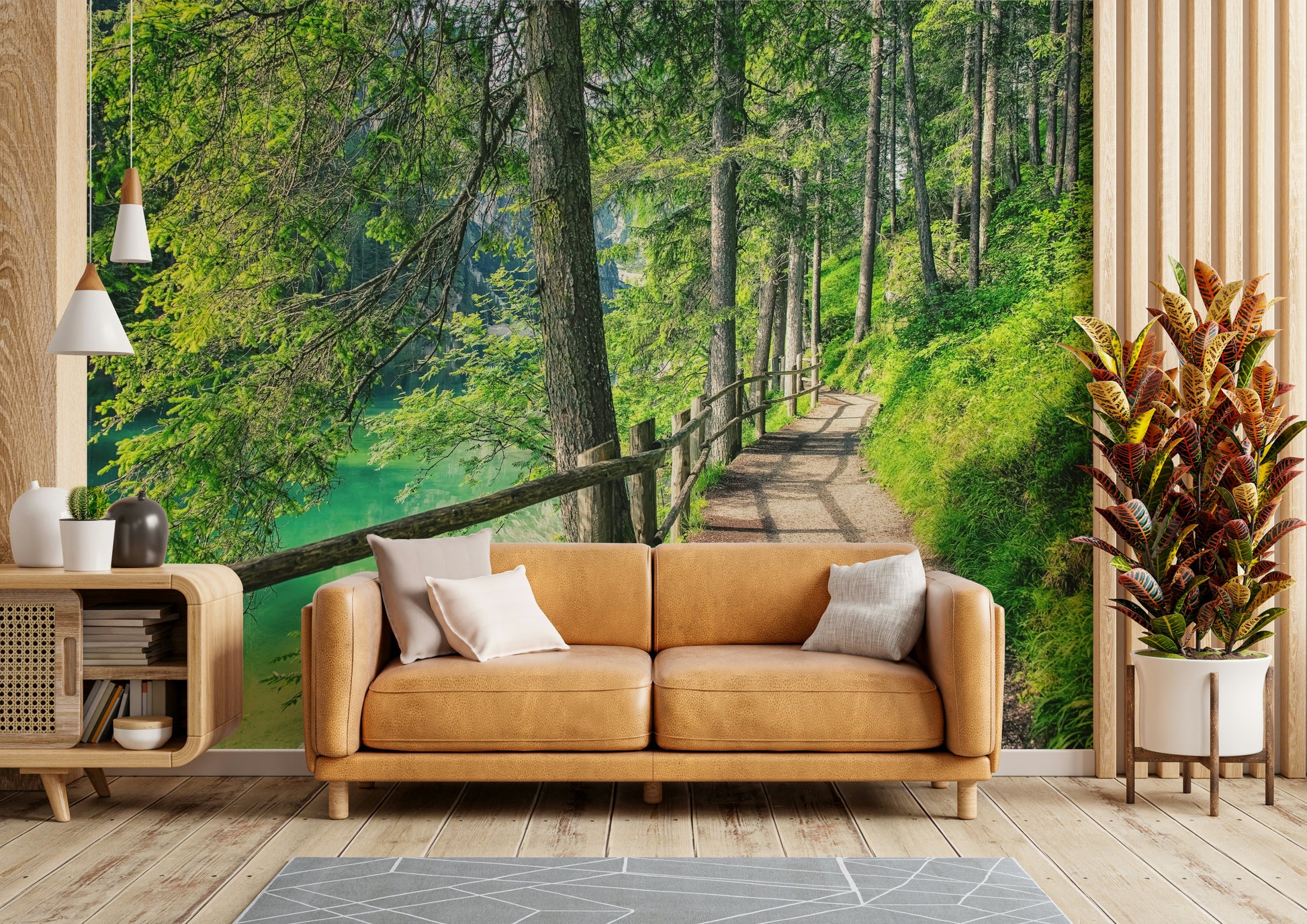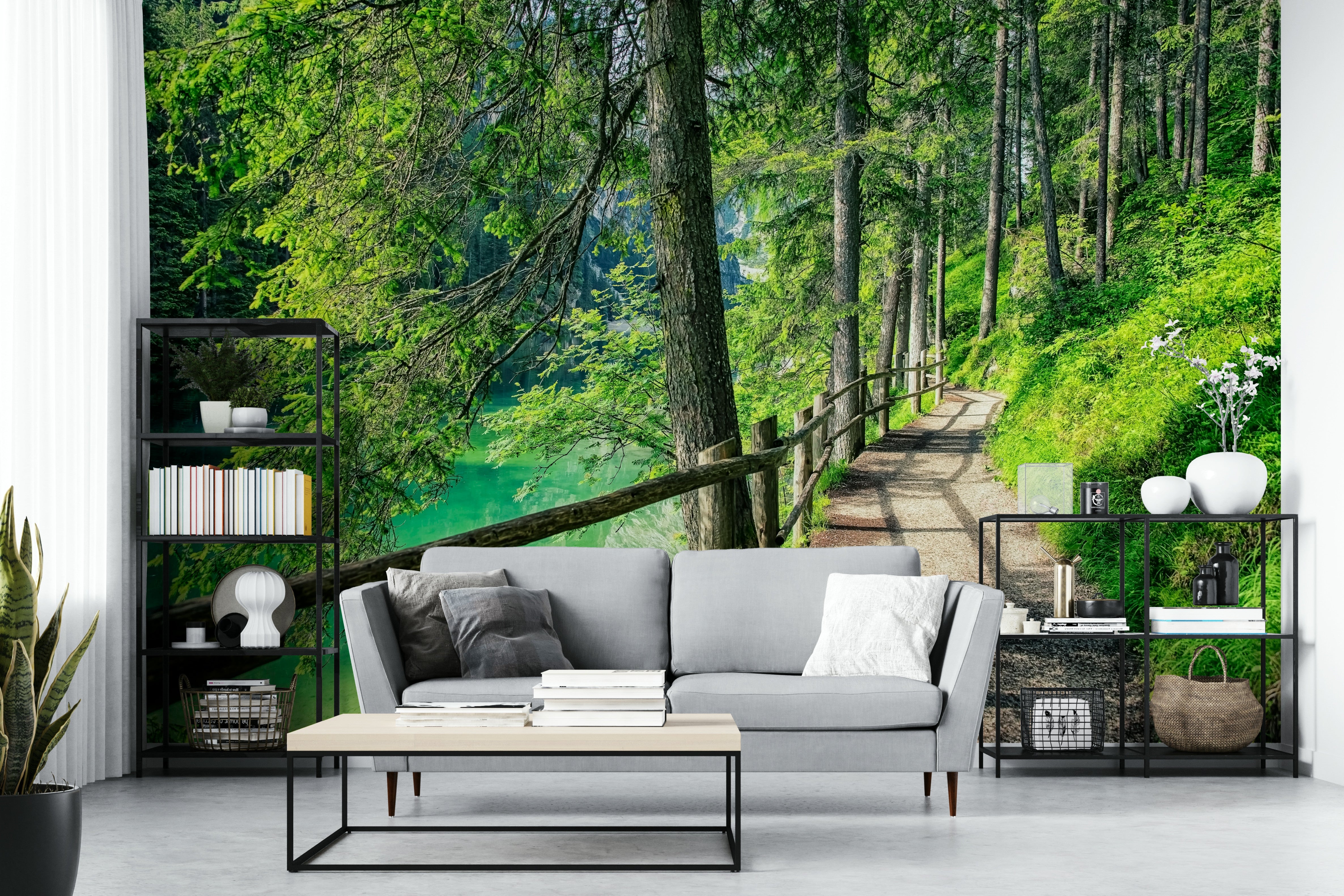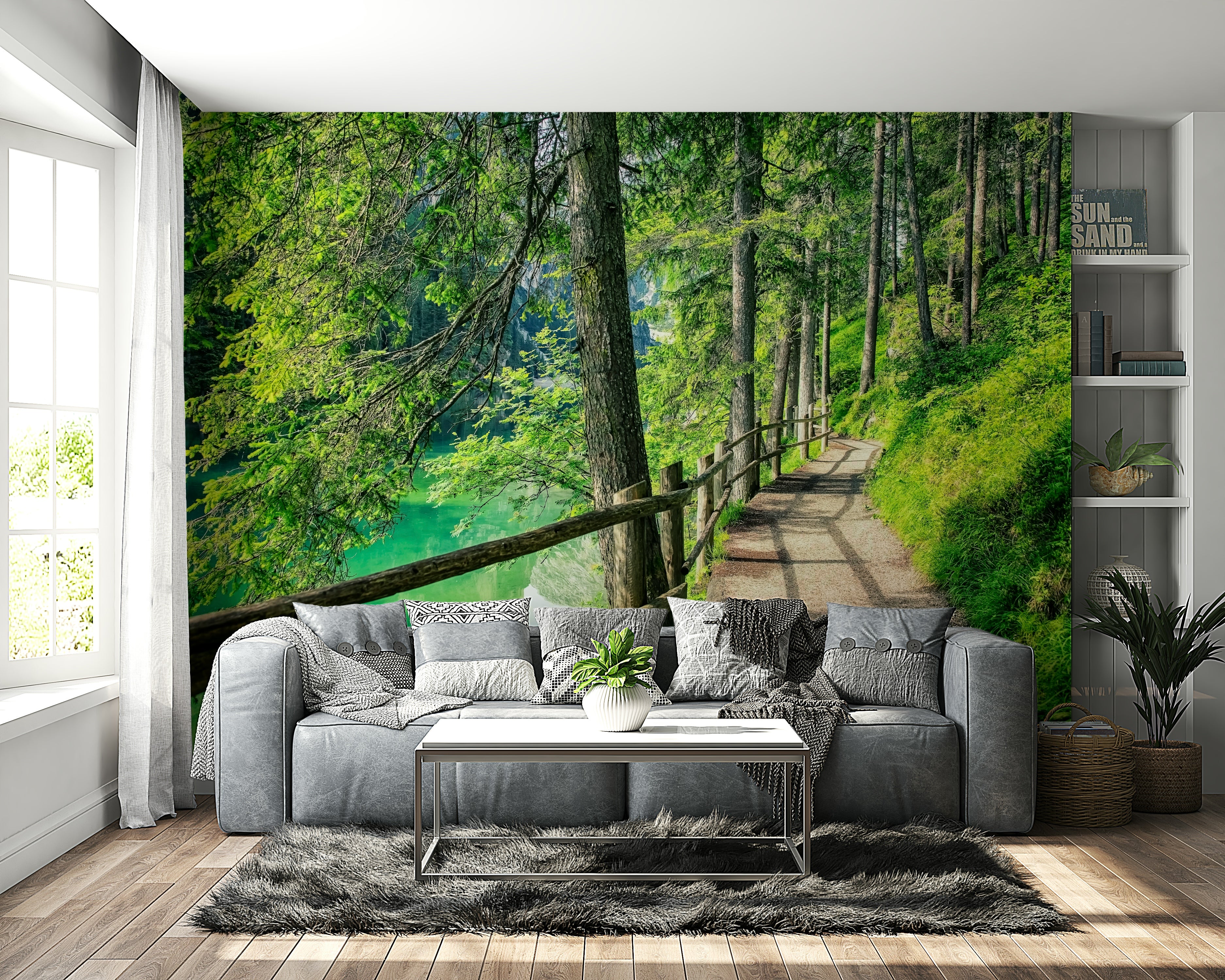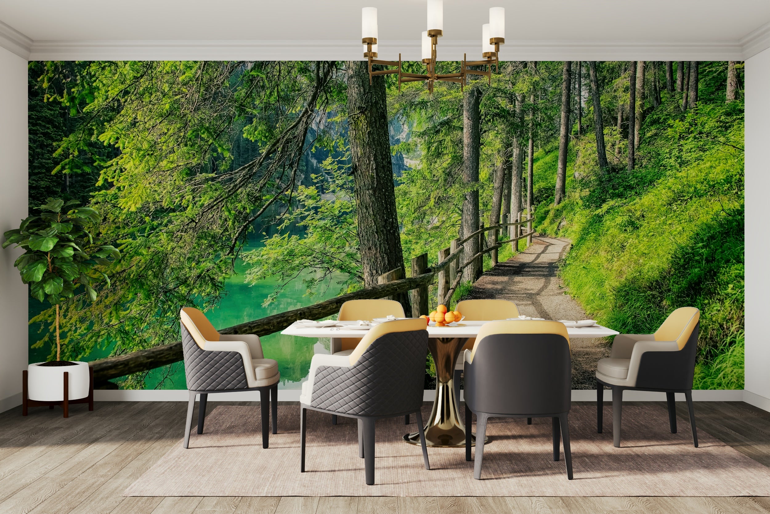 A serene pathway winds alongside a vibrant emerald lake, nestled within a lush forest. Sunlight filters through the dense canopy, casting dappled shadows on the gravel path. The crystal-clear water reflects the surrounding trees and cliffs, creating a mirror-like effect. A rustic wooden fence lines the path, adding a touch of natural charm. This wallpaper evokes a sense of tranquility and invites you to escape into the peaceful embrace of nature. The image is perfect for those who appreciate the beauty of natural landscapes and seek a calming and restorative atmosphere in their home or workspace.