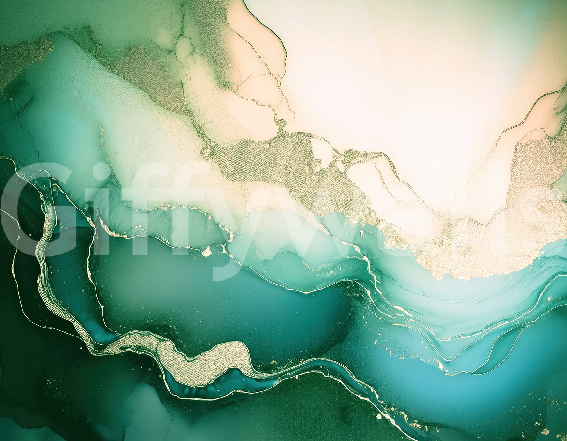 Abstract marble mural blending emerald, white, and gold tones for a refined, natural aesthetic.
