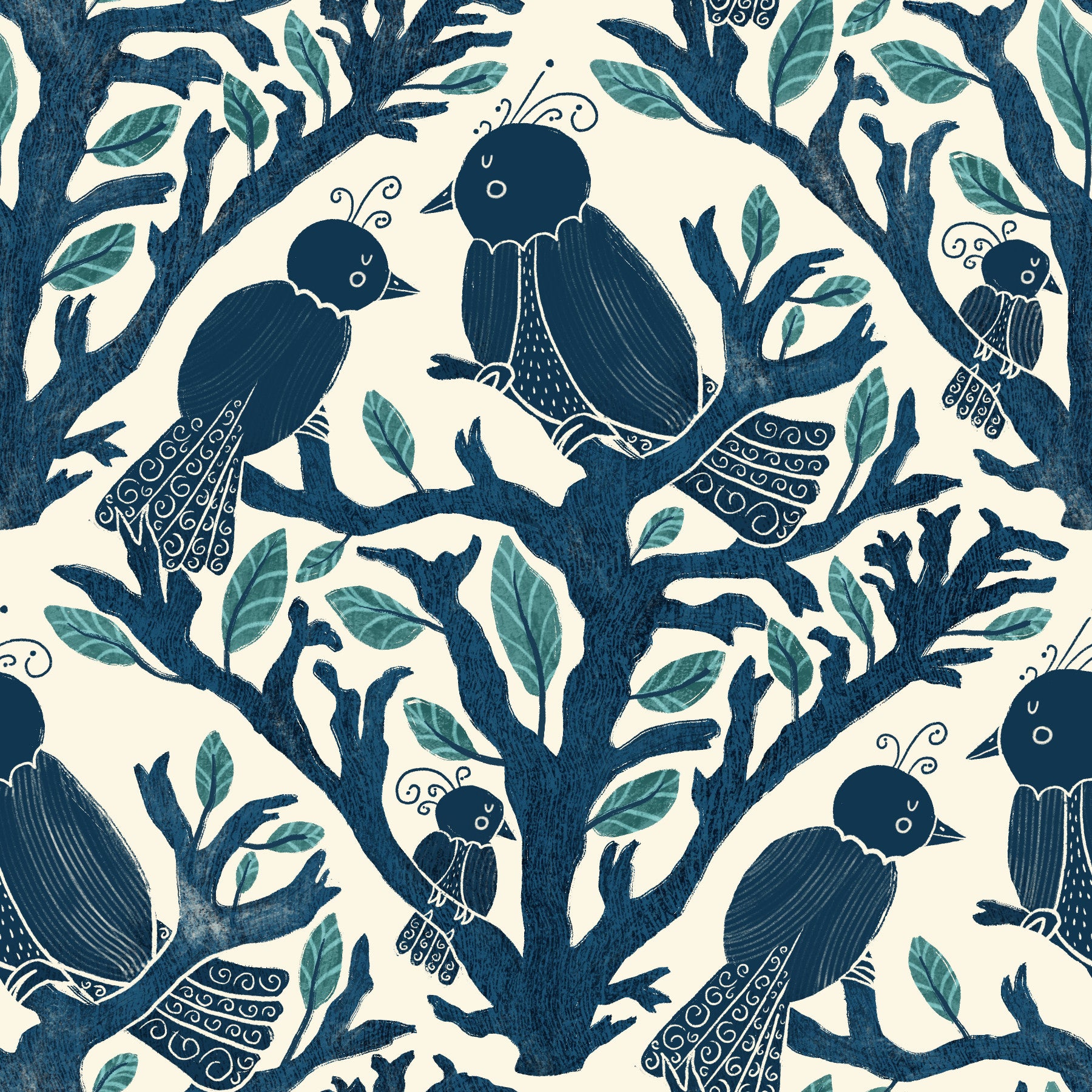 This whimsical wallpaper transports you to an enchanted forest, where stylized birds perch on intricately detailed branches. The color palette of deep blues and soft greens creates a calming and serene atmosphere. The hand-drawn style adds a touch of folk art charm, perfect for adding a touch of magic and tranquility to any room. The seamless pattern ensures a cohesive and visually pleasing design, ideal for creating a statement wall or wrapping an entire space in this soothing woodland scene.