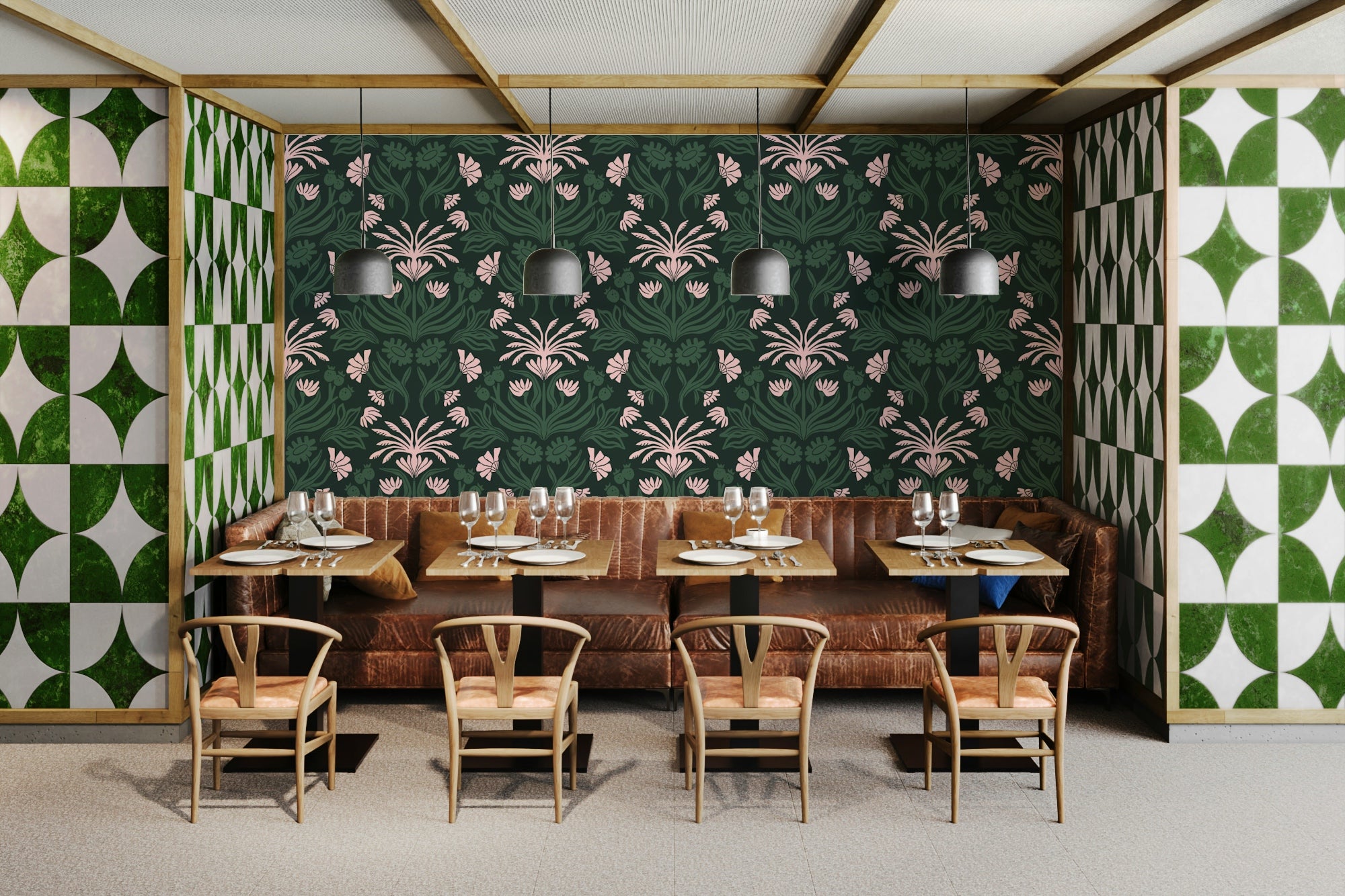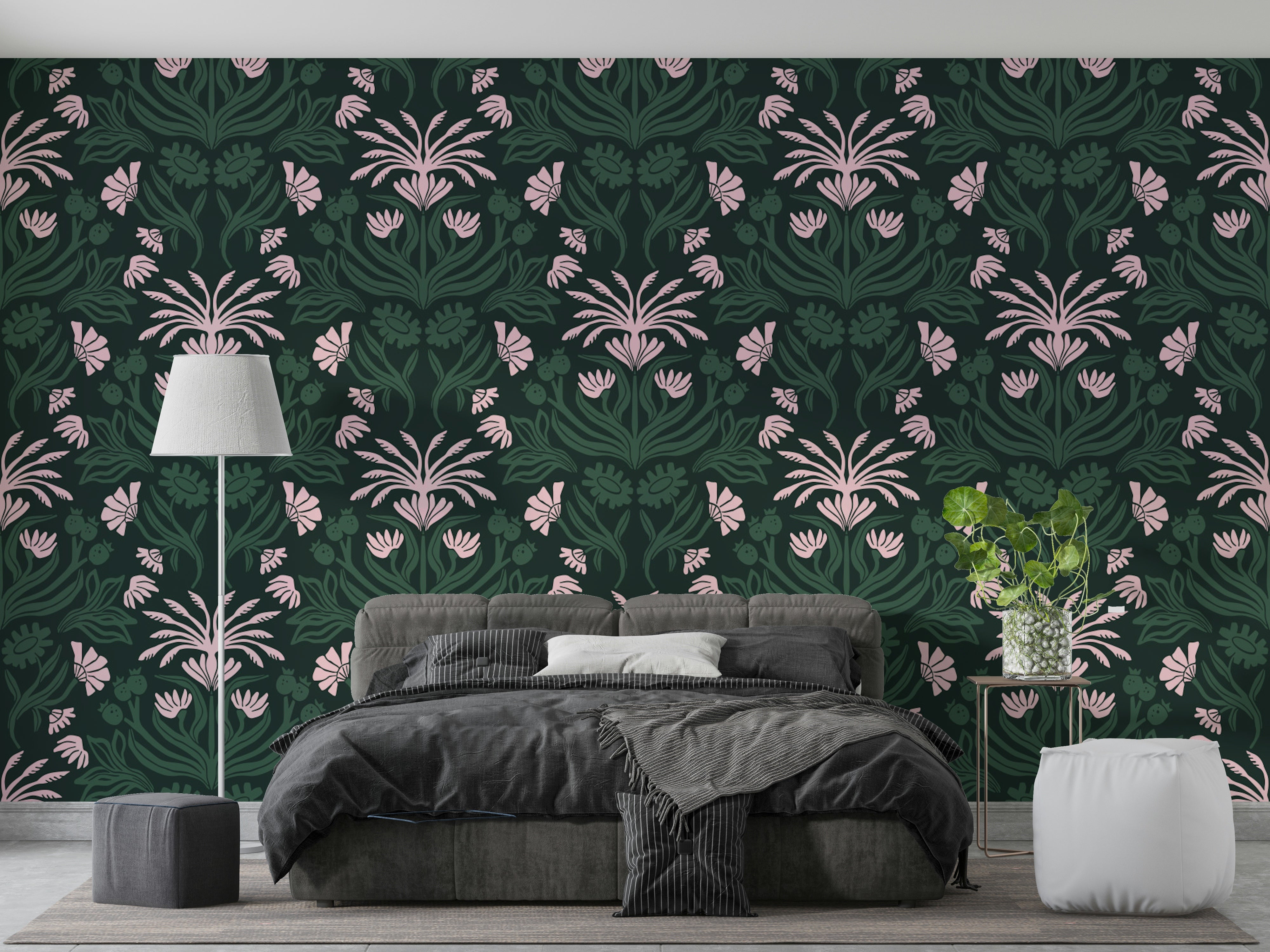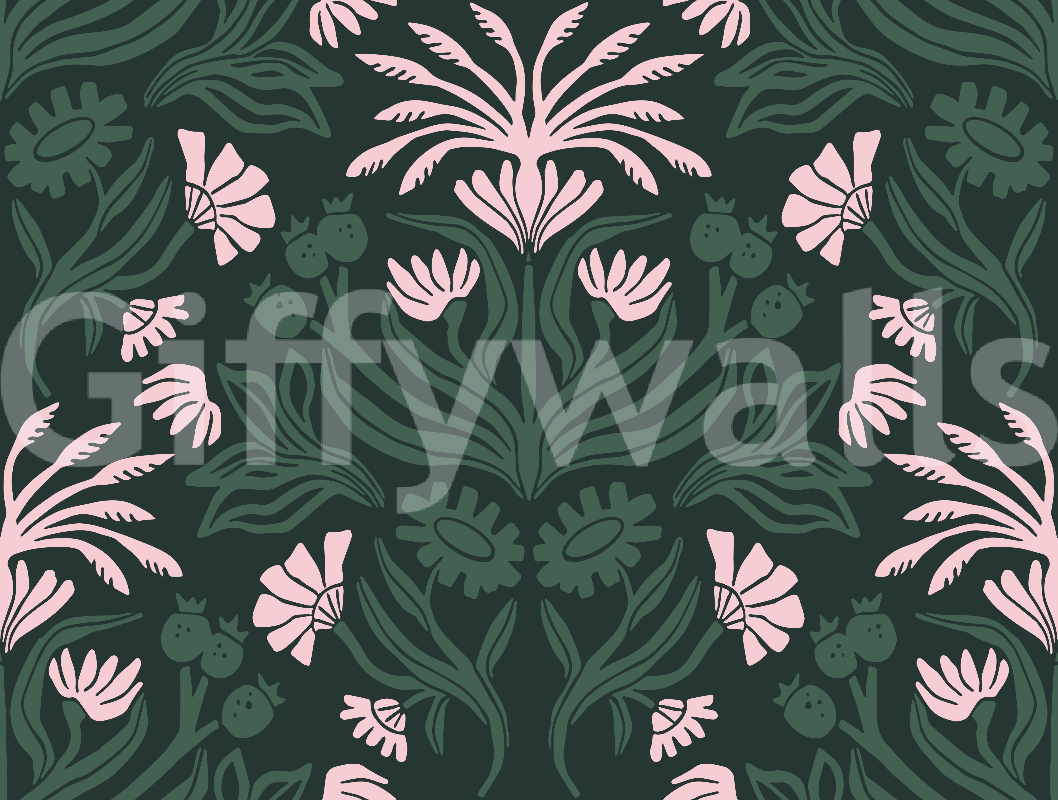 Step into a serene world with this enchanting floral wallpaper. The design features stylized pink blossoms gracefully intertwined with verdant foliage against a deep, forest green backdrop. The symmetrical arrangement creates a calming, harmonious visual, perfect for bedrooms or living areas. The botanical elements are bold yet delicate, offering a touch of nature-inspired beauty that's both modern and timeless. This wallpaper adds a touch of sophistication and tranquility to any space, creating a stylish sanctuary.
