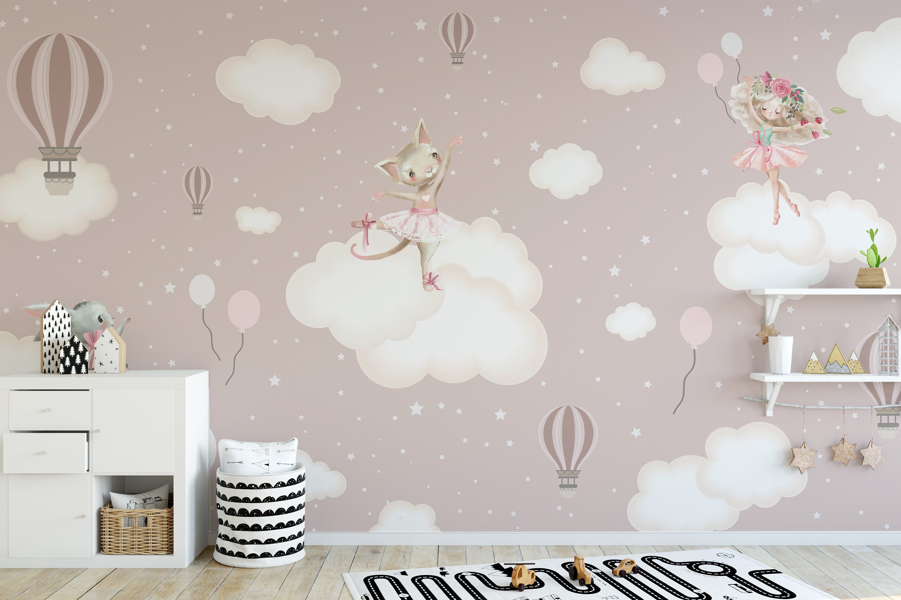 Bring a touch of magic to any girl's bedroom with the enchanted clouds wall mural. This clouds and sky wallpaper mural fills the room with a sense of wonder, featuring playful animals and soft, fluffy clouds against a pastel backdrop. It's perfect for sparking imagination and creating a cozy for girls’ room wallpaper mural, whimsical haven for rest and play. Delight your little one with this charming scene that encapsulates the joy of childhood in every detail.