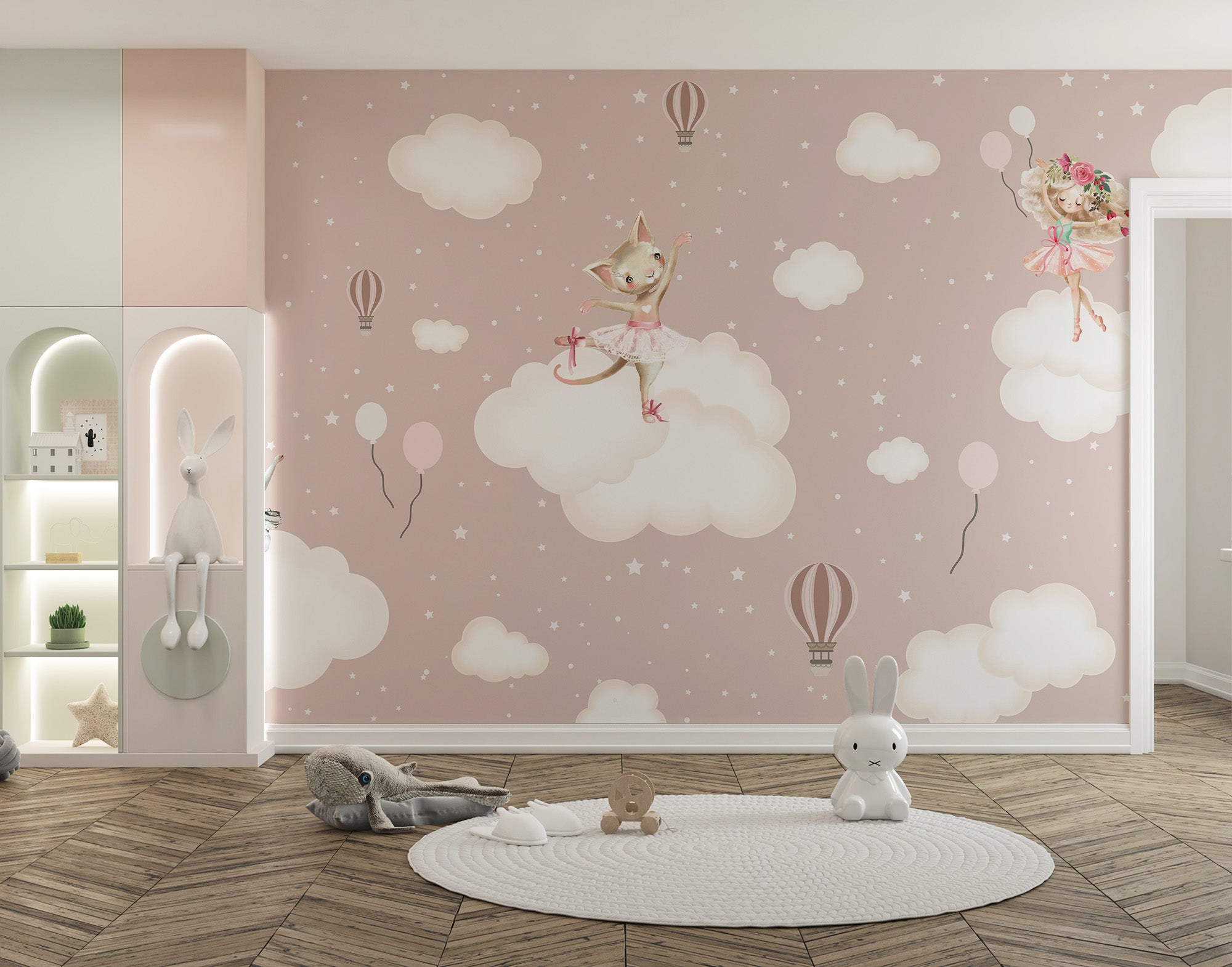 Pastel enchanted cloud mural with playful characters