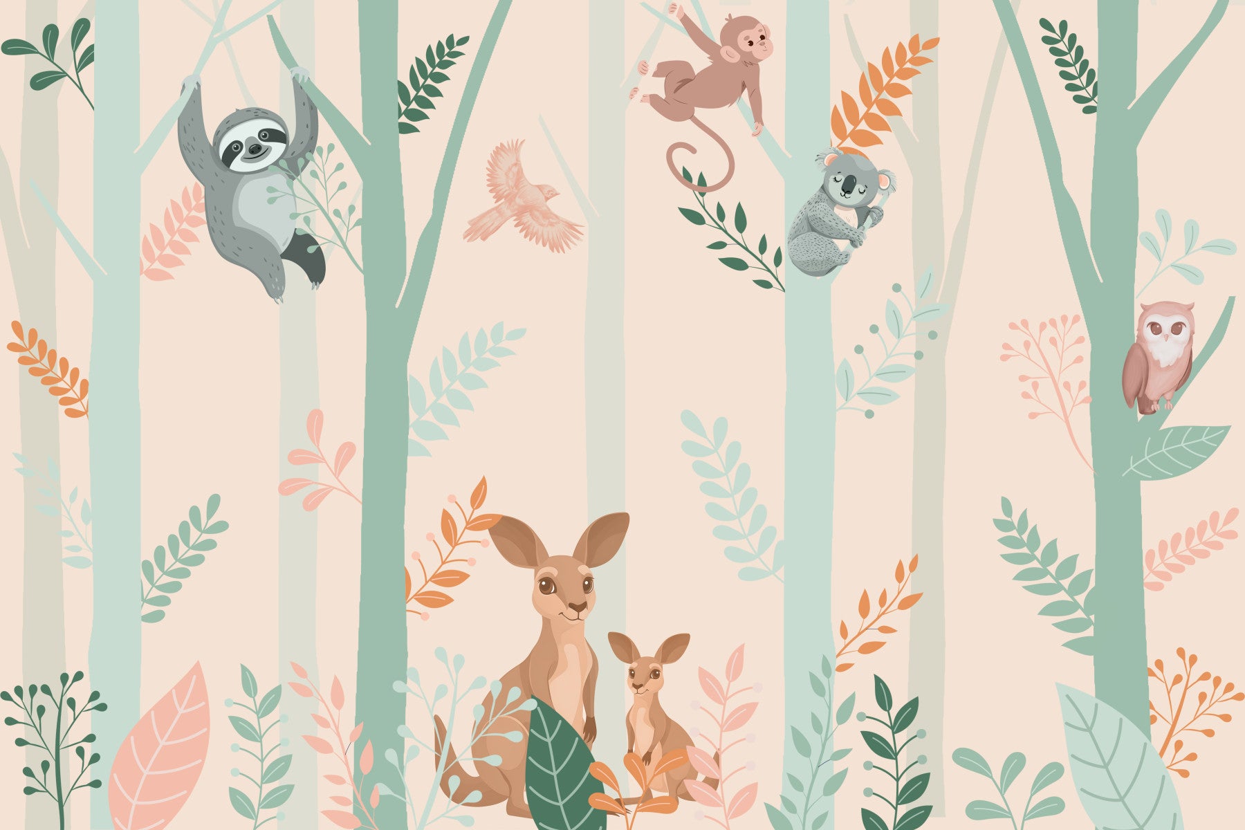 Invite woodland charm into your child's room with this sweet animal-themed wallpaper. See how it transforms nurseries, bedrooms, and playrooms with a soft, nature-inspired palette of blush pink, muted green, and earthy tones. It is a pretty wallpaper for walls. The charming design brings together kangaroos, koalas, and more in a whimsical forest scene, fostering a sense of wonder. This is perfect for creating a calming, playful space. It works great with rustic or Scandinavian interiors.