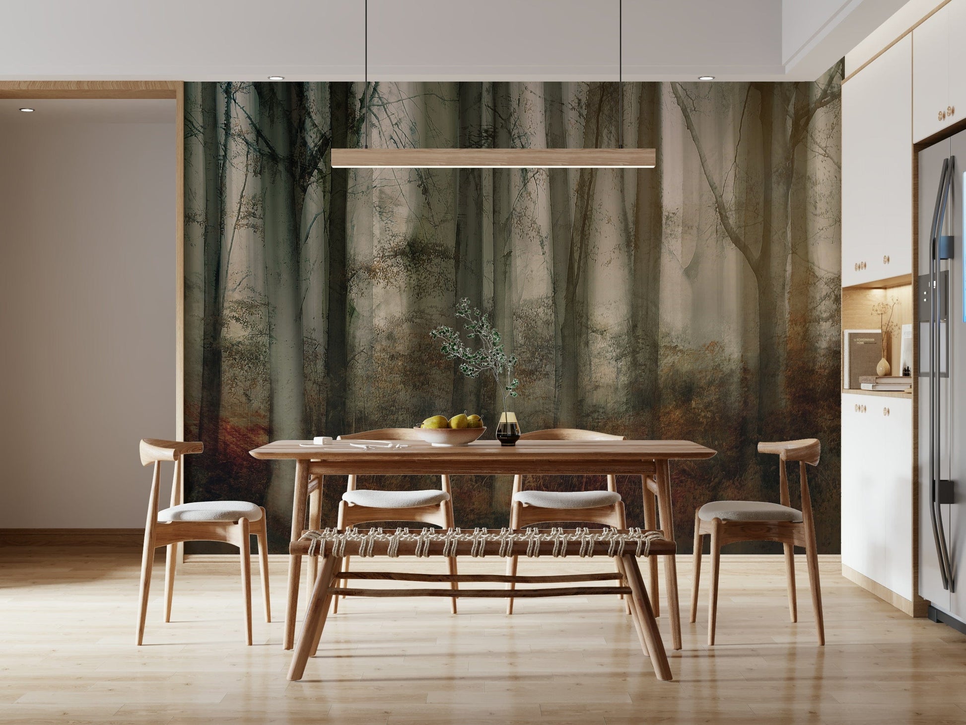 Invite the serenity of a misty woodland into your home. This design showcases a forest scene with an artistic, hazy effect. The muted tones of beige, brown, and grey create a soothing and timeless feel. This wallpaper for walls works wonderfully in a bedroom, living room, or hallway. It brings a touch of nature inside, especially when paired with wood accents and natural light. Let this design transform your interiors.
