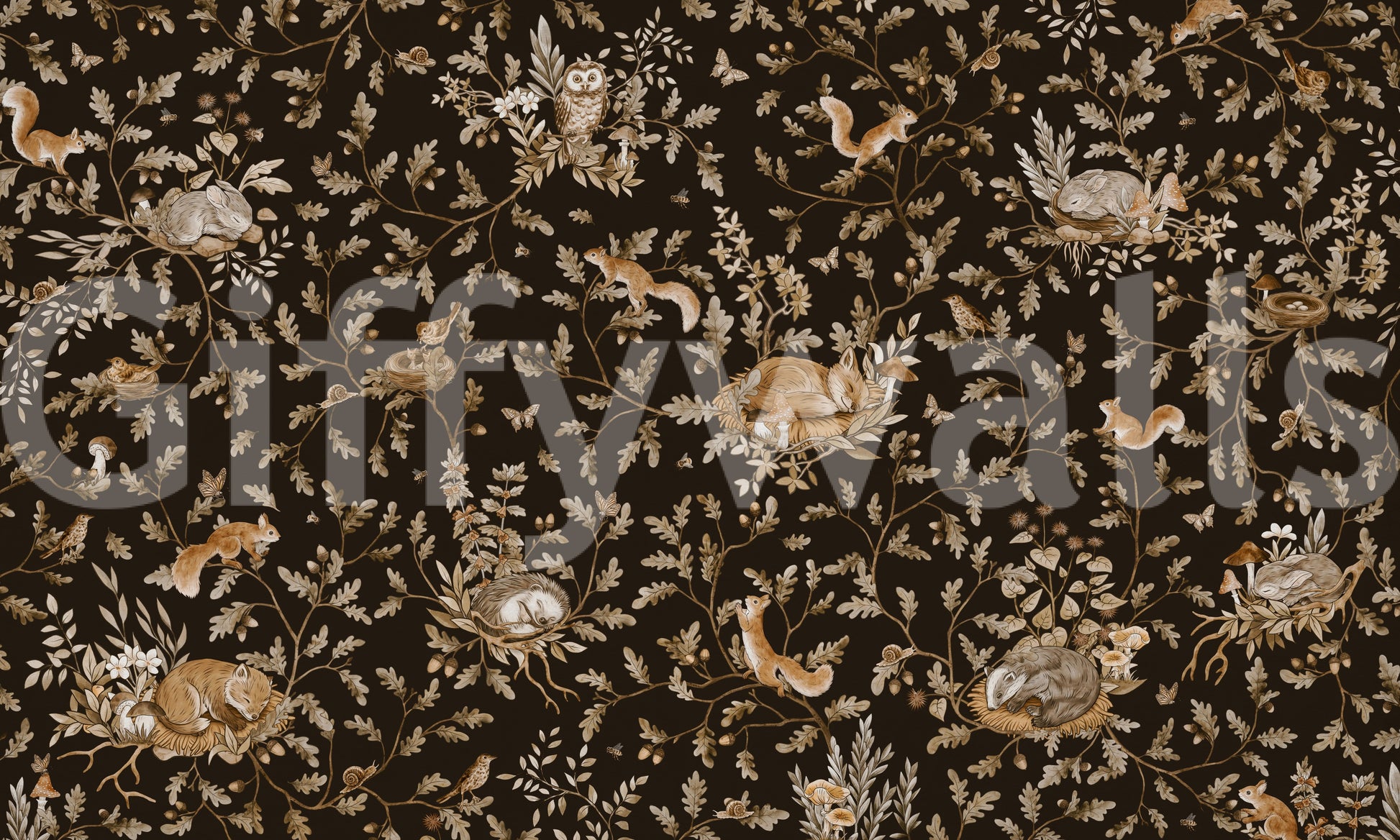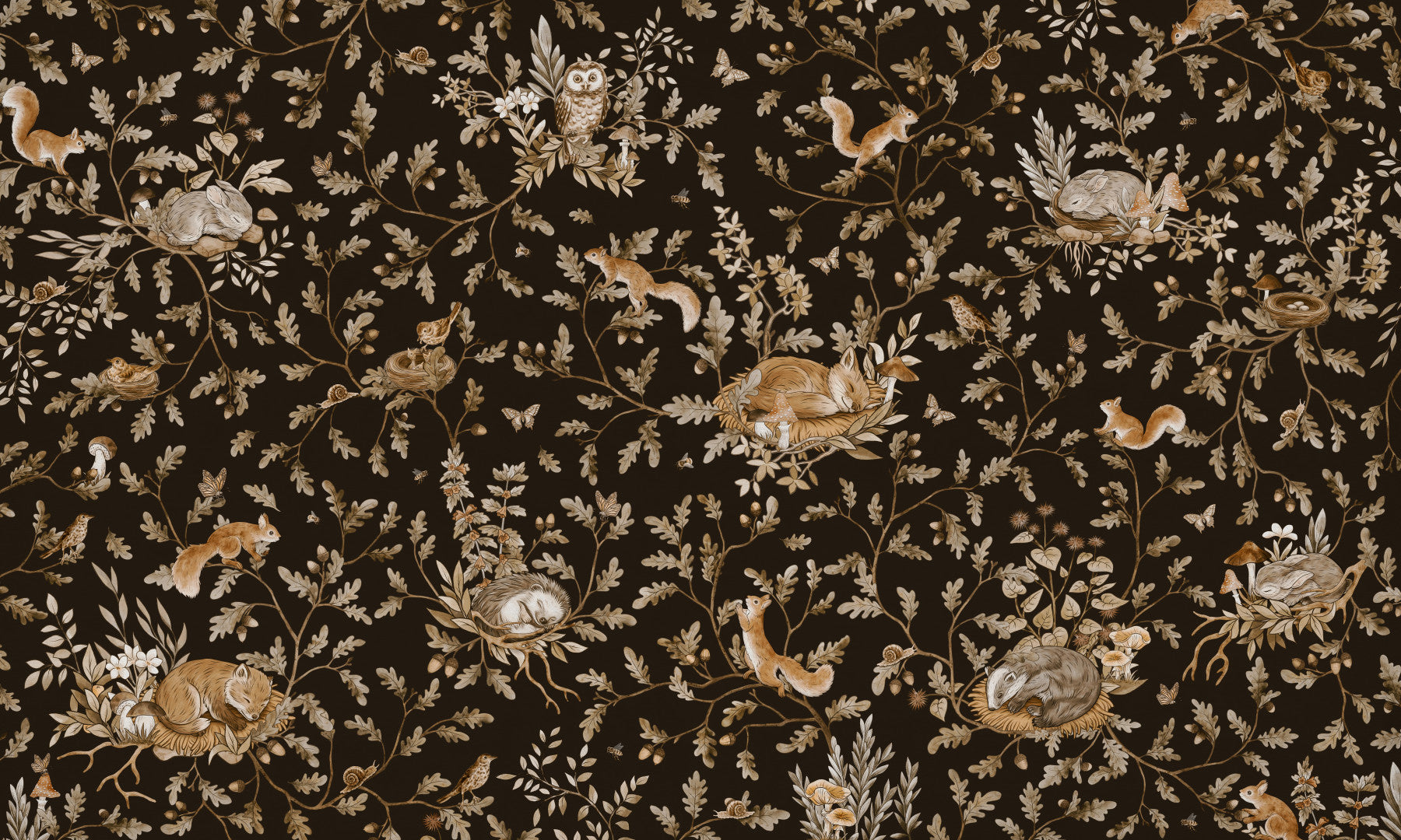 Introduce a storybook charm with this woodland-inspired design. Adorable squirrels, foxes, and hedgehogs settle down amongst oak leaves, mushrooms, and butterflies. Earthy tones and a dark background create a cosy, classic atmosphere. Ideal wallpaper for walls in a nursery, bedroom, or reading nook, this design adds a touch of magic to any interior. It also works nicely to enhance bedrooms, bathrooms, and hallways.