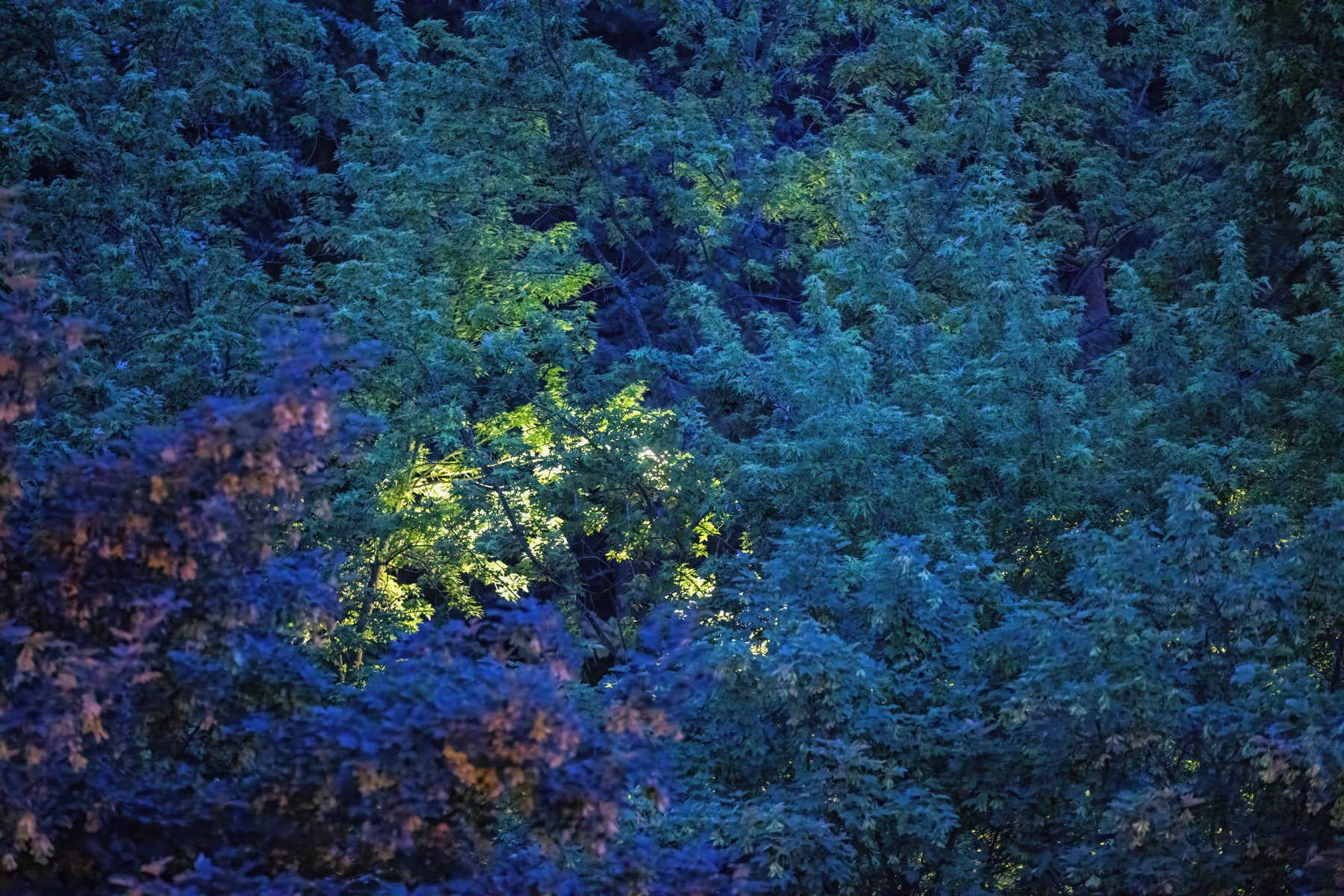 This stunning art piece presents a serene night scene, where deep blues and vibrant greens intertwine among the foliage. The gentle illumination peeking through the trees reveals a tranquil atmosphere, inviting contemplation and peace. Whether displayed in a living room, bedroom, or workspace, this artwork embodies the calming essence of a forest at night, making it a wonderful addition to your decor.