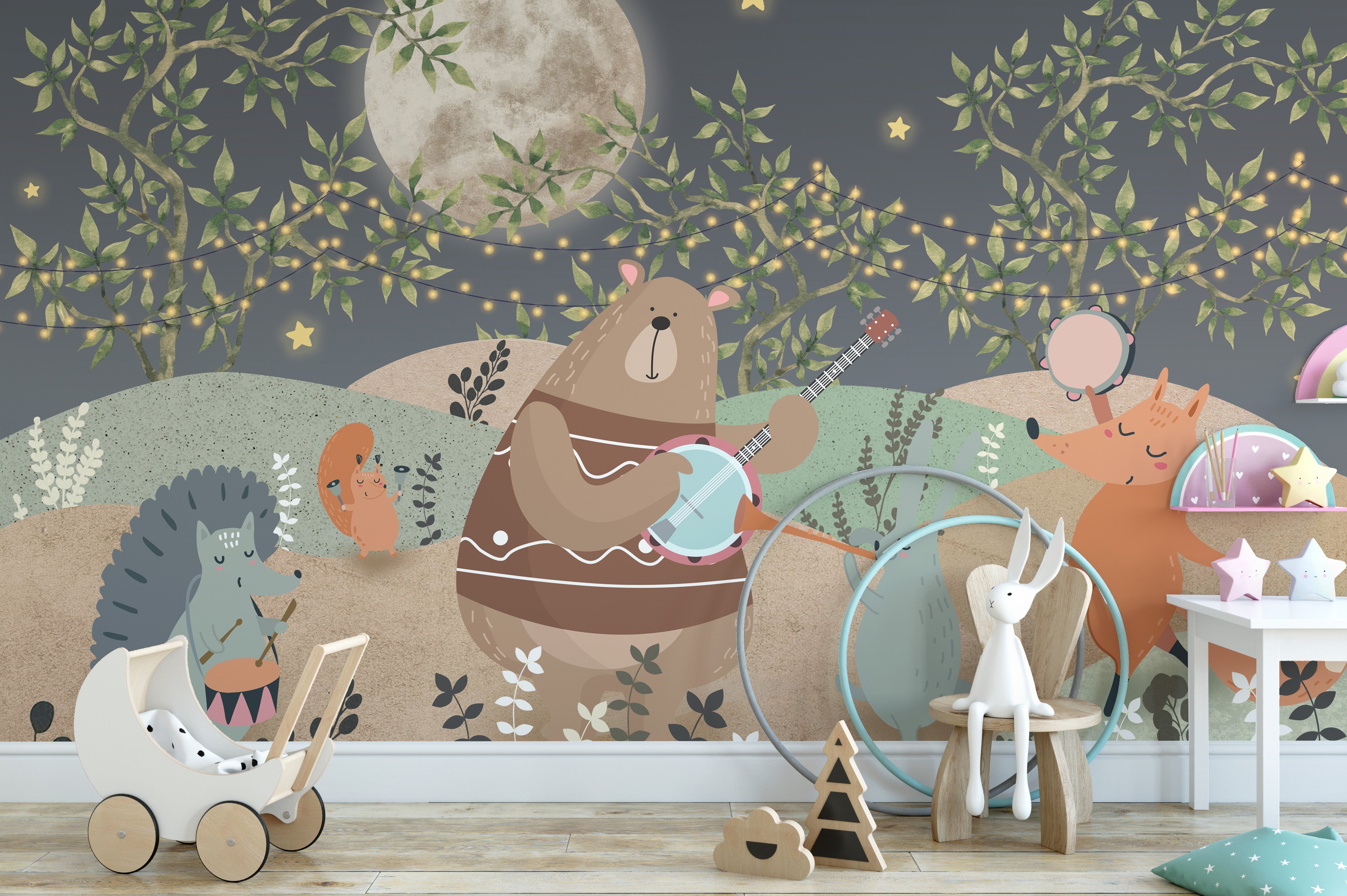 Kids’ mural with forest animals and stars