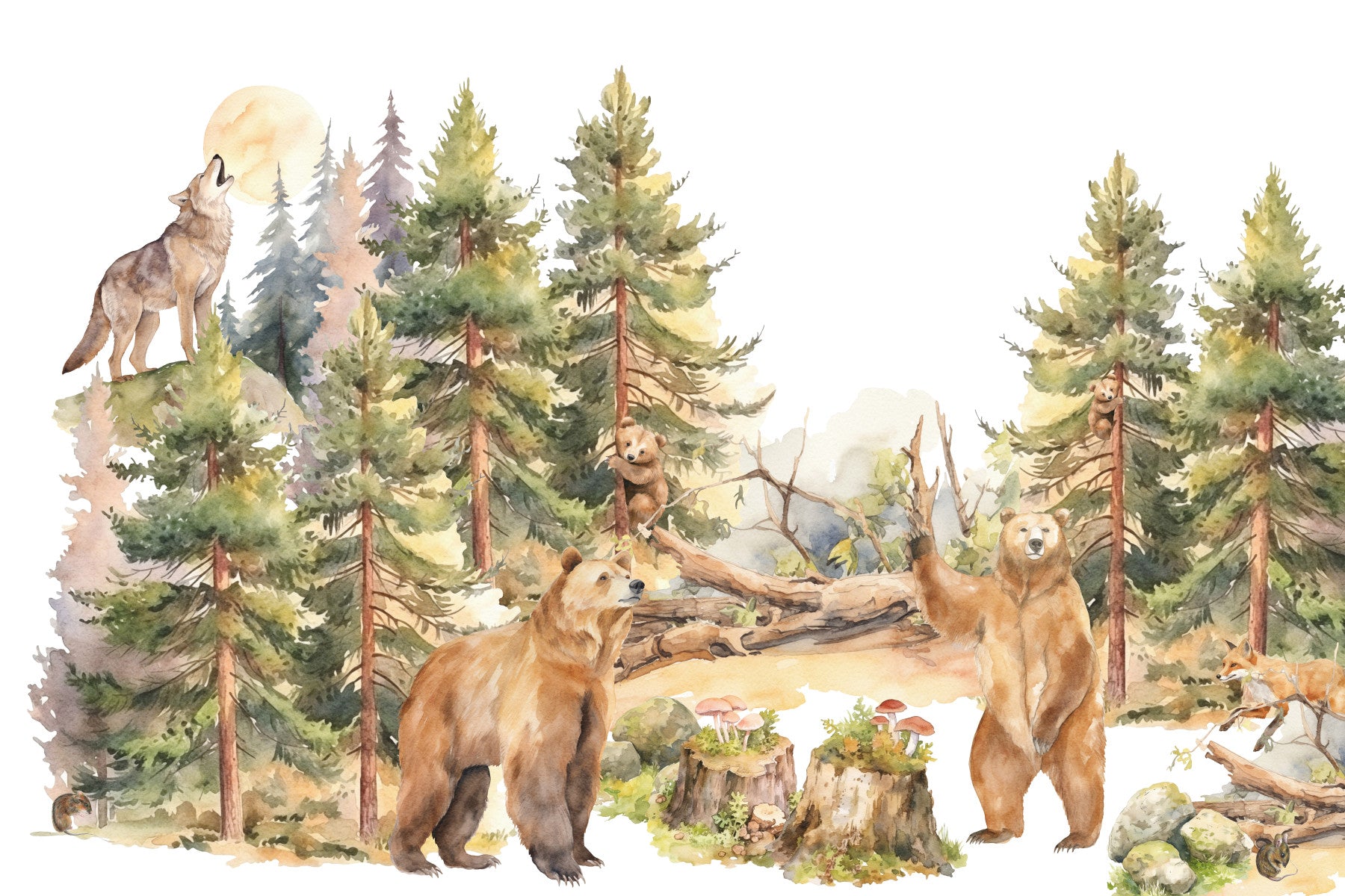Journey into an enchanted forest with this captivating watercolor wallpaper. Two majestic brown bears stand amidst a grove of tall pine trees, their cubs playfully climbing nearby. A howling wolf watches from a rocky outcrop, under the glow of a full moon. This dreamy scene is rendered in soft, muted tones, creating a feeling of tranquility and wonder. The intricate details of the forest floor and the expressive animal poses invite you to lose yourself in its magic.