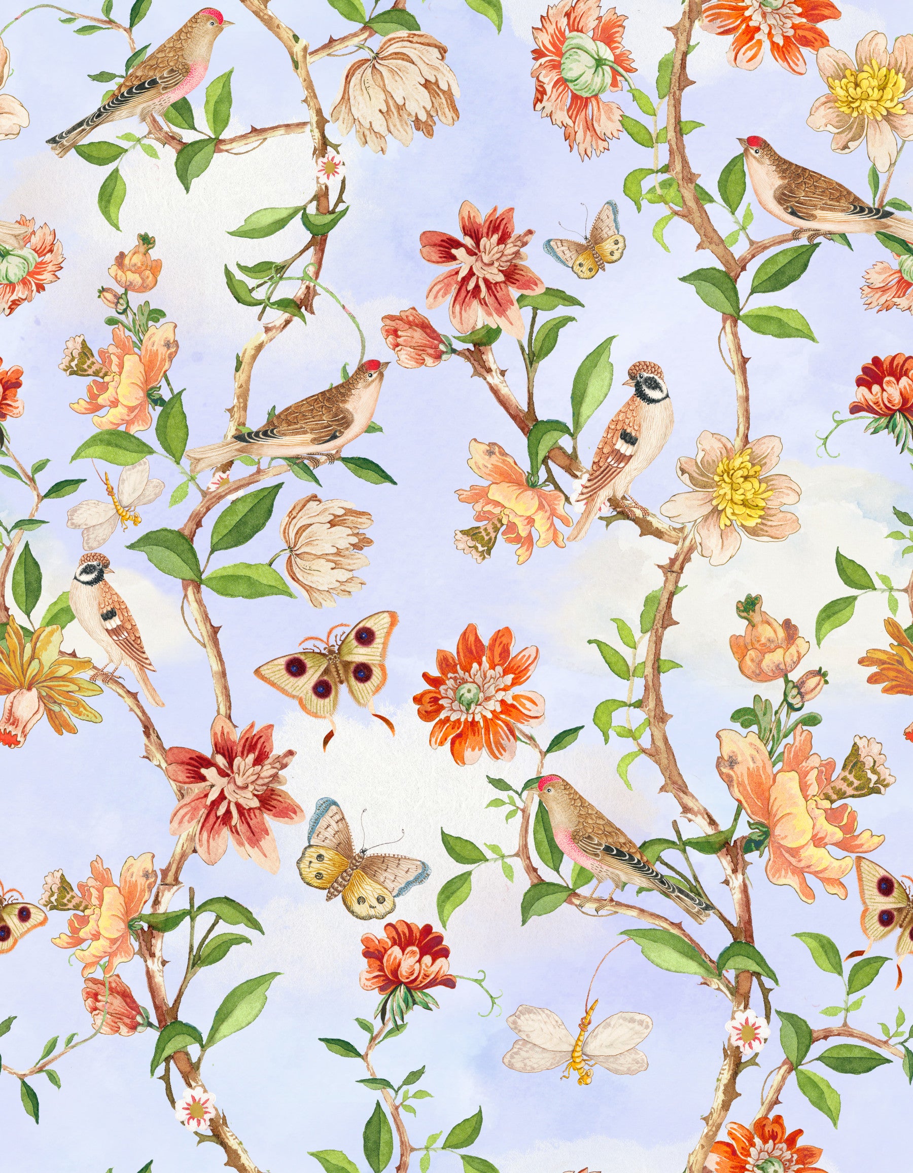 Botanical wallpaper featuring soft birds and intricate flower clusters.