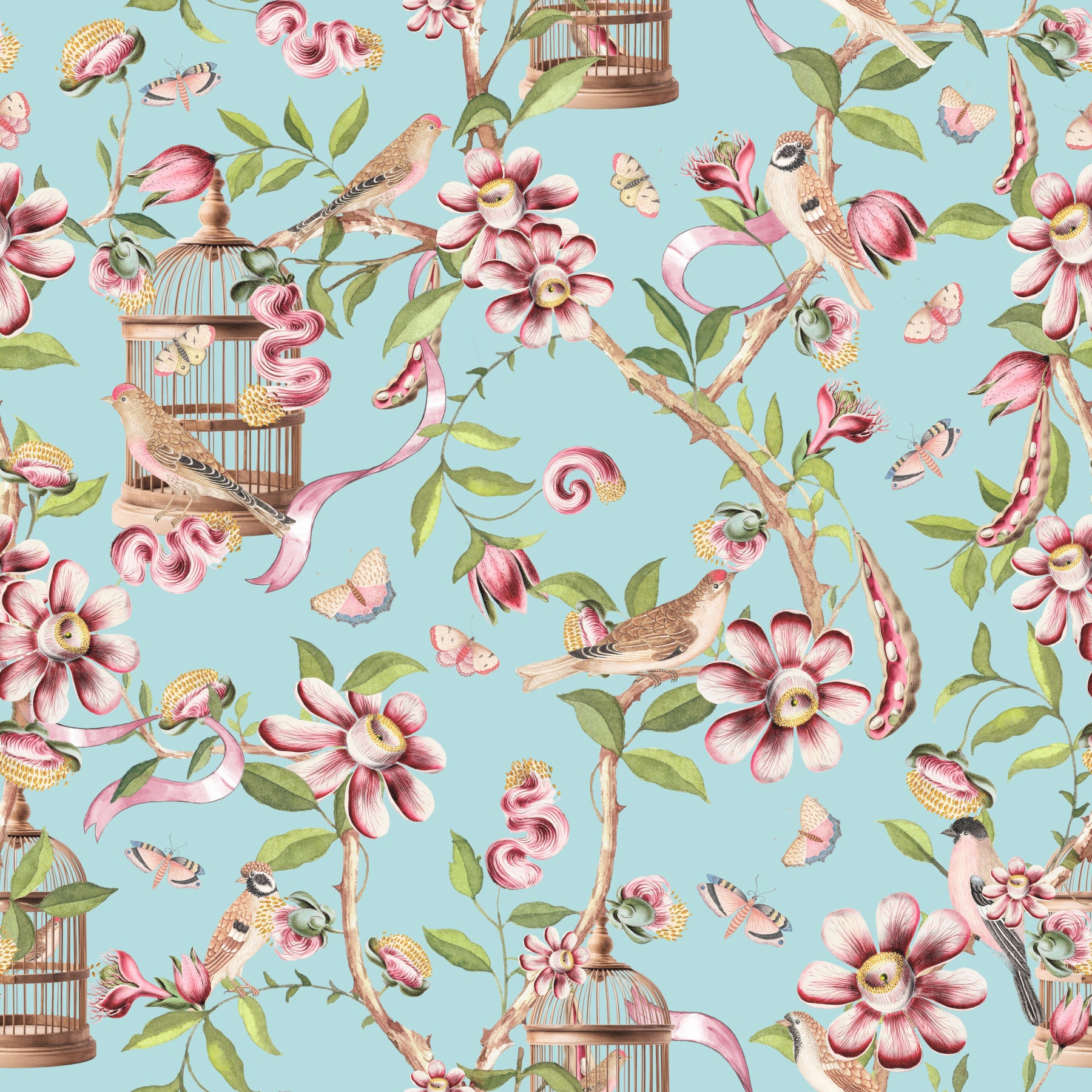 Escape to a whimsical wonderland with this enchanting wallpaper. Birds perch gracefully amongst lush, hand-painted flowers and fluttering butterflies, all rendered in a captivating watercolor style. Delicate pink blossoms and soft greens create a soothing palette, while the inclusion of antique birdcages adds a layer of intriguing history and artistry. This dreamy design is perfect for creating a serene and romantic ambiance in any space, particularly bedrooms and nurseries. The seamless pattern ensures a cohesive and captivating visual experience, perfect for those seeking a wallpaper that is both beautiful and calming.