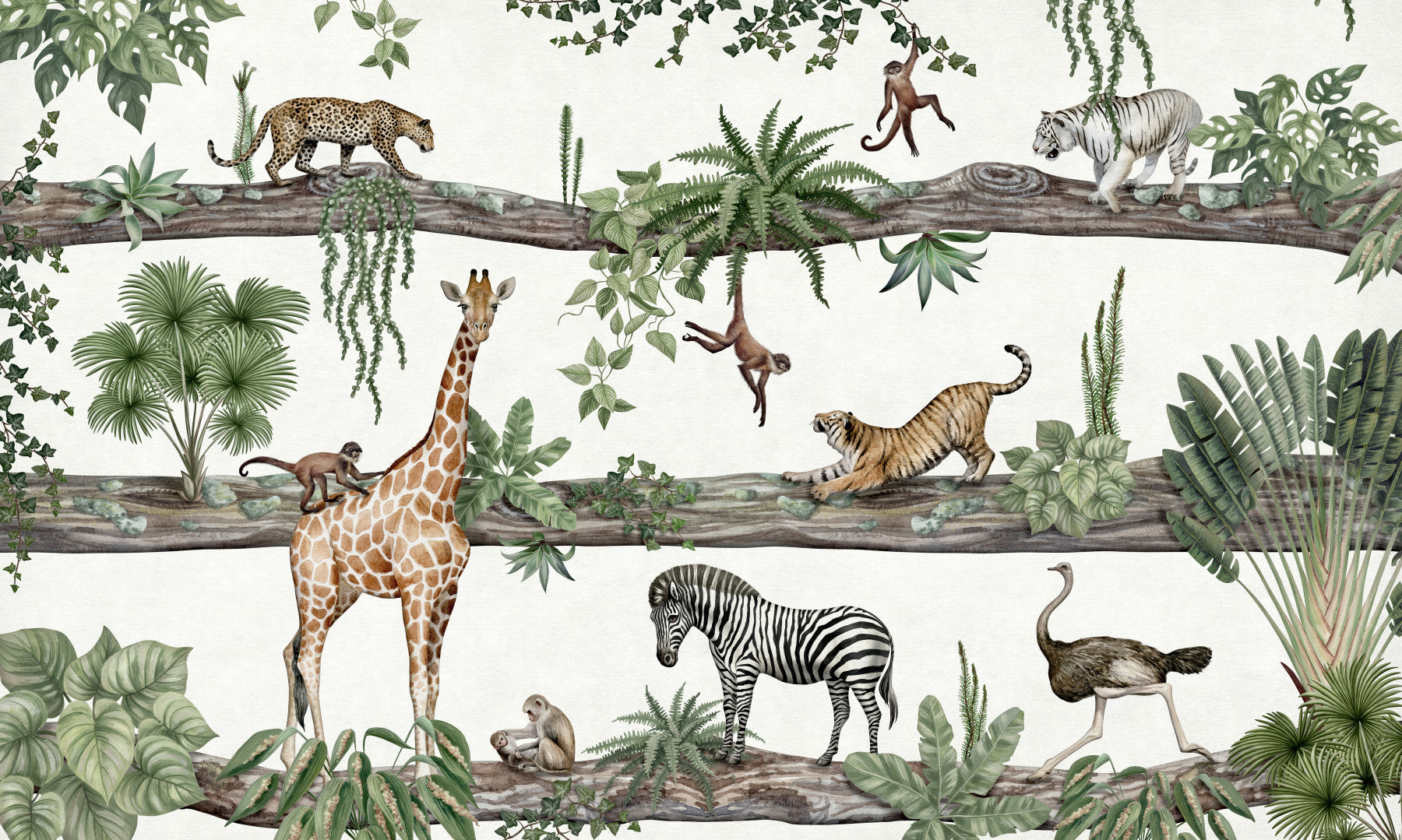 Step into a whimsical world with our Enchanted Jungle Scene wallpaper, a captivating blend of wildlife and verdant foliage. This delightful design features majestic creatures such as leopards, tigers, giraffes, zebras, and even playful monkeys, all rendered in exquisite detail against a soft, textured backdrop. Lush tropical plants and creeping vines frame the scene, creating a sense of depth and immersion. The harmonious color palette of greens, browns, and subtle neutrals evokes a serene and inviting atmosphere, perfect for adding a touch of nature's magic to any room. Let your imagination run wild as you explore this vibrant ecosystem, where adventure and tranquility coexist in perfect harmony. This wallpaper is an excellent choice for nurseries, bedrooms, or any space where you want to create a playful and enchanting ambiance.