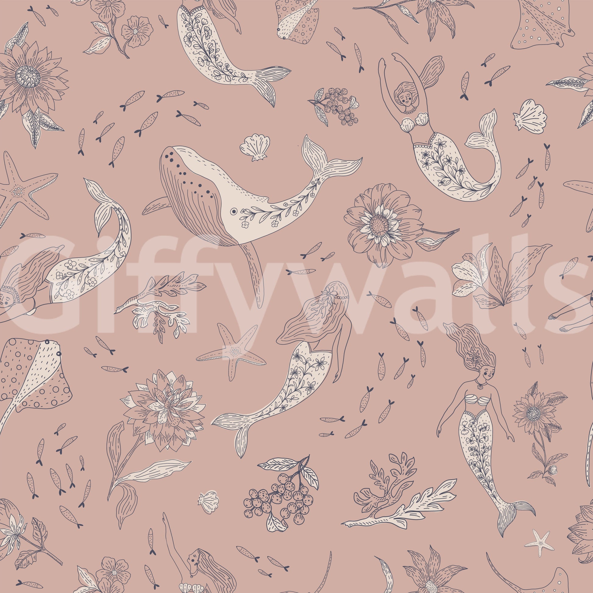Dive into a dreamy underwater world with this enchanting wallpaper. Delicate line drawings of graceful mermaids, playful whales, and vibrant floral elements create a whimsical and serene atmosphere. The soft blush pink background enhances the ethereal quality of the design, making it perfect for a tranquil bedroom or calming nursery. The seamless pattern ensures a cohesive and aesthetically pleasing look in any space, adding a touch of magic to your walls. This wallpaper effortlessly blends elements of nature and fantasy, resulting in a sophisticated yet playful design that's both calming and enchanting.