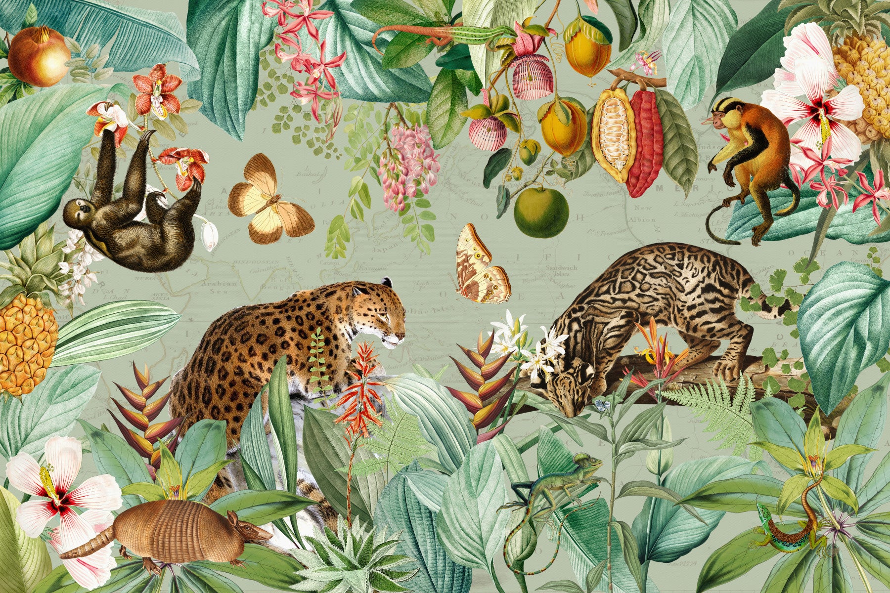 Escape to a mystical rainforest with this dreamy wallpaper. Detailed illustrations of exotic animals, including jaguars, monkeys, and sloths, blend seamlessly with vibrant tropical flowers and lush foliage. The faded map adds a sense of history and adventure, inviting you to explore the hidden corners of this lush world. The muted greens and warm earth tones create a calming and serene atmosphere, perfect for bedrooms, living rooms, or nurseries. The wallpaper is a perfect blend of fantasy and realism, making it an enchanting addition to any home.