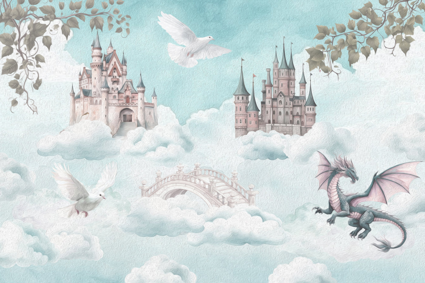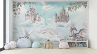 Soft pastel clouds cradle majestic castles in a world of wonder. A soaring dragon spreads its wings, bringing a mythical touch to the scene. This fantasy castle wallpaper creates an ethereal escape where dreams take flight. The dragon wallpaper for walls blends rich detail with soft textures, making any space feel magical. Floating bridges and doves add to the magical sky castle mural, bringing a fairytale charm. This enchanted fairytale wallpaper captures a storybook essence, perfect for those who love whimsical designs. Let this floating castle mural bring a sense of adventure and fantasy to any interior.