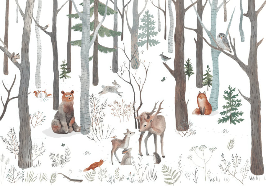 Let the Enchanted White Forest Wall Mural be the canvas for your child's dreams and play. Here, squirrels scamper in perpetual play, and owls guard the tranquility of the night, creating a nurturing environment that encourages sleep filled with the sweetest of dreams. It's more than just a wall covering, it's a piece of a fairy tale that your child can live every day.This kids room wallpaper brings the outdoors into the comfort of your home, offering a peaceful retreat for storytime or a vibrant playground for the imagination.