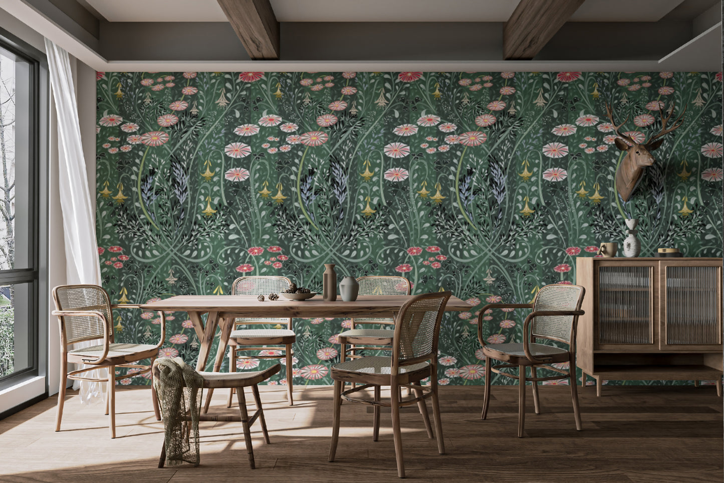 Discover a world where lush foliage and delicate florals meet in a harmonious blend of natural beauty. This green wallpaper encapsulates the essence of a serene meadow, bringing the outdoors in with its rich, verdant tones and a symphony of blooming flowers. Each roll is a canvas that captures the whimsical dance of wildflowers, beckoning you to lose yourself in its intricate design. Perfect for those who wish to infuse their homes with the vibrancy of nature's palette, this wallpaper is a tribute to the splendor of the earth’s botanical wonders.