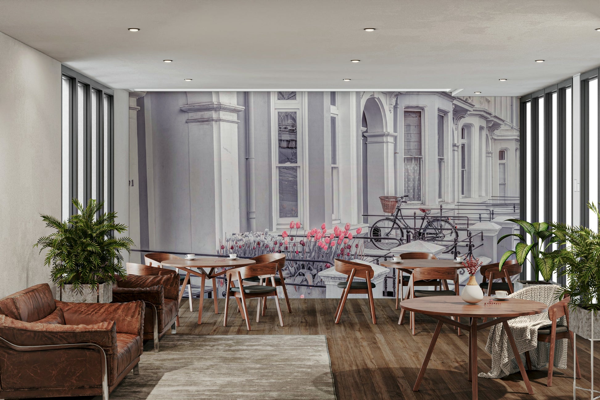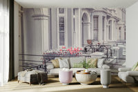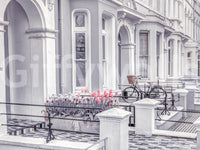 Colourful english houses facades in Notting Hill, London. Bring subtle charm to your home with this wallpaper for walls featuring an elegant row of London townhouses. The architectural details, soft colour palette, and the bicycle add a touch of life. It has a timeless style. The design works great in a living room or hallway. It brings elegance and serenity to a space.