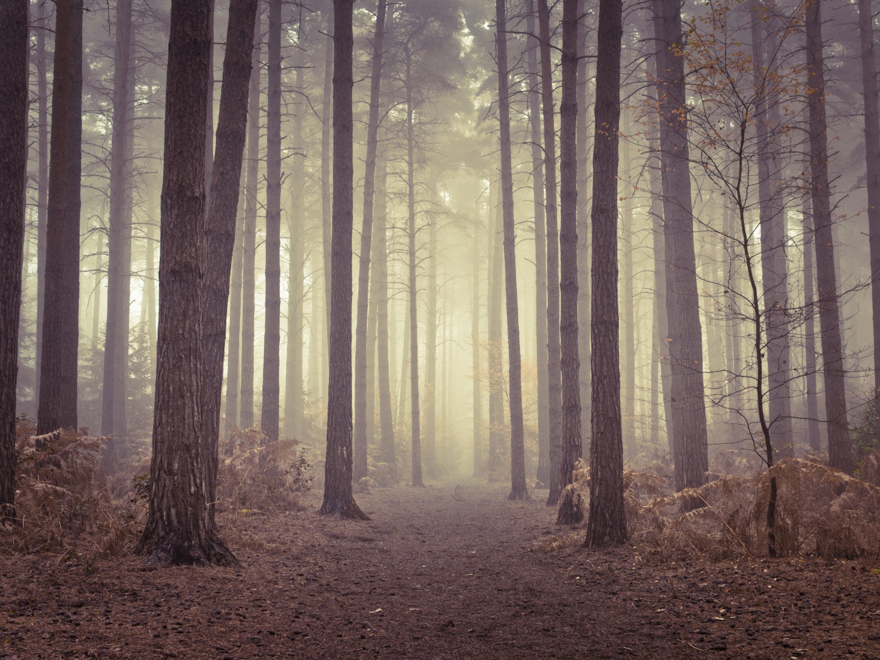 Enigmatic Beauty of Forest Wall Mural in bedroom, tall trees and fog, calm wall accent