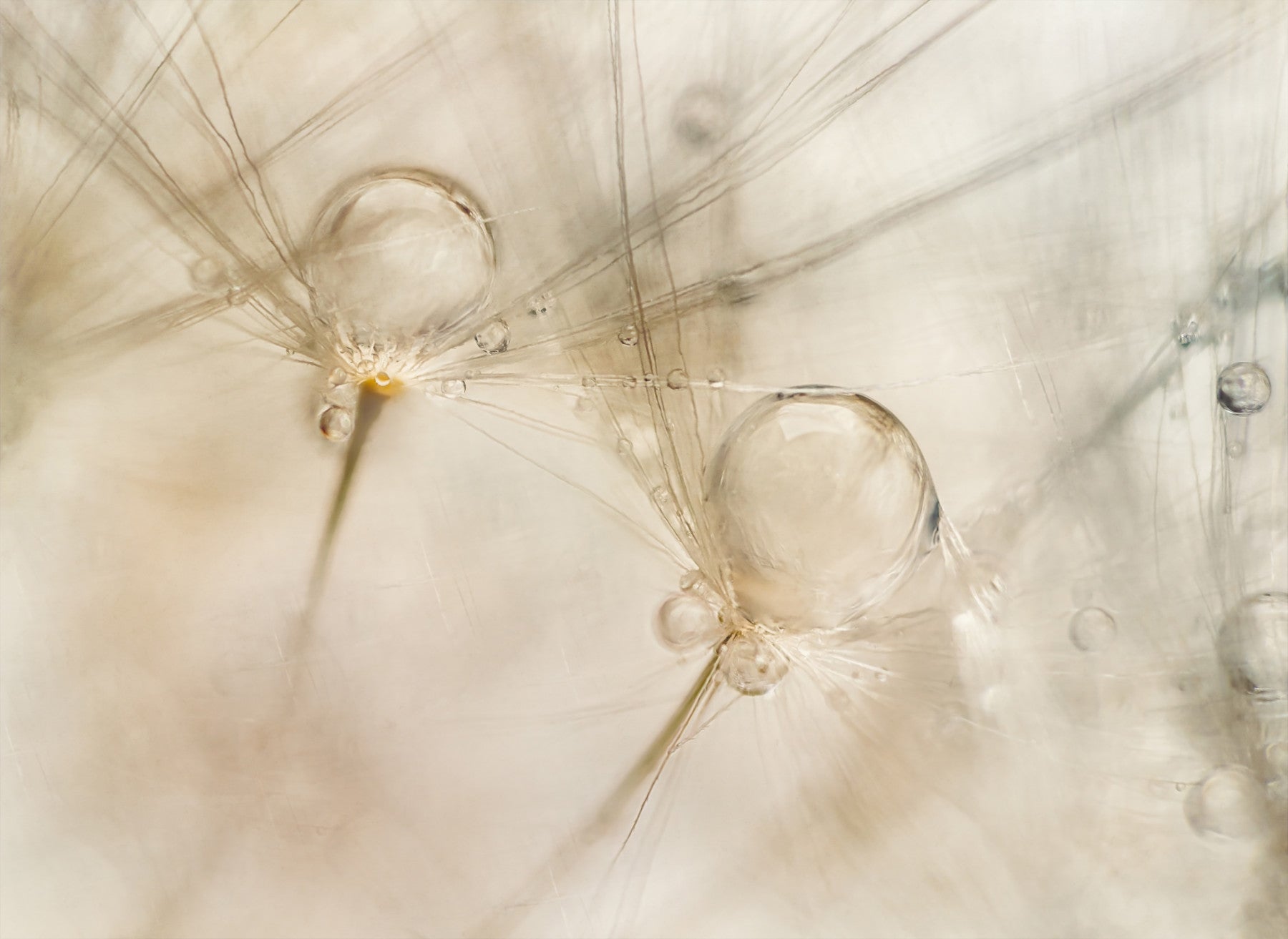 Observe a close-up view of delicate dewdrops clinging to the ethereal structure of a dandelion seedhead. This design evokes a sense of calm and showcases nature's fragility. Soft beige tones blend seamlessly into any room. It is the perfect wallpaper for walls to bring a soothing, organic element indoors. It would be great for a bedroom, bathroom, or hallway, fostering a serene and minimalist ambiance. The muted palette ensures it complements a variety of decor styles.