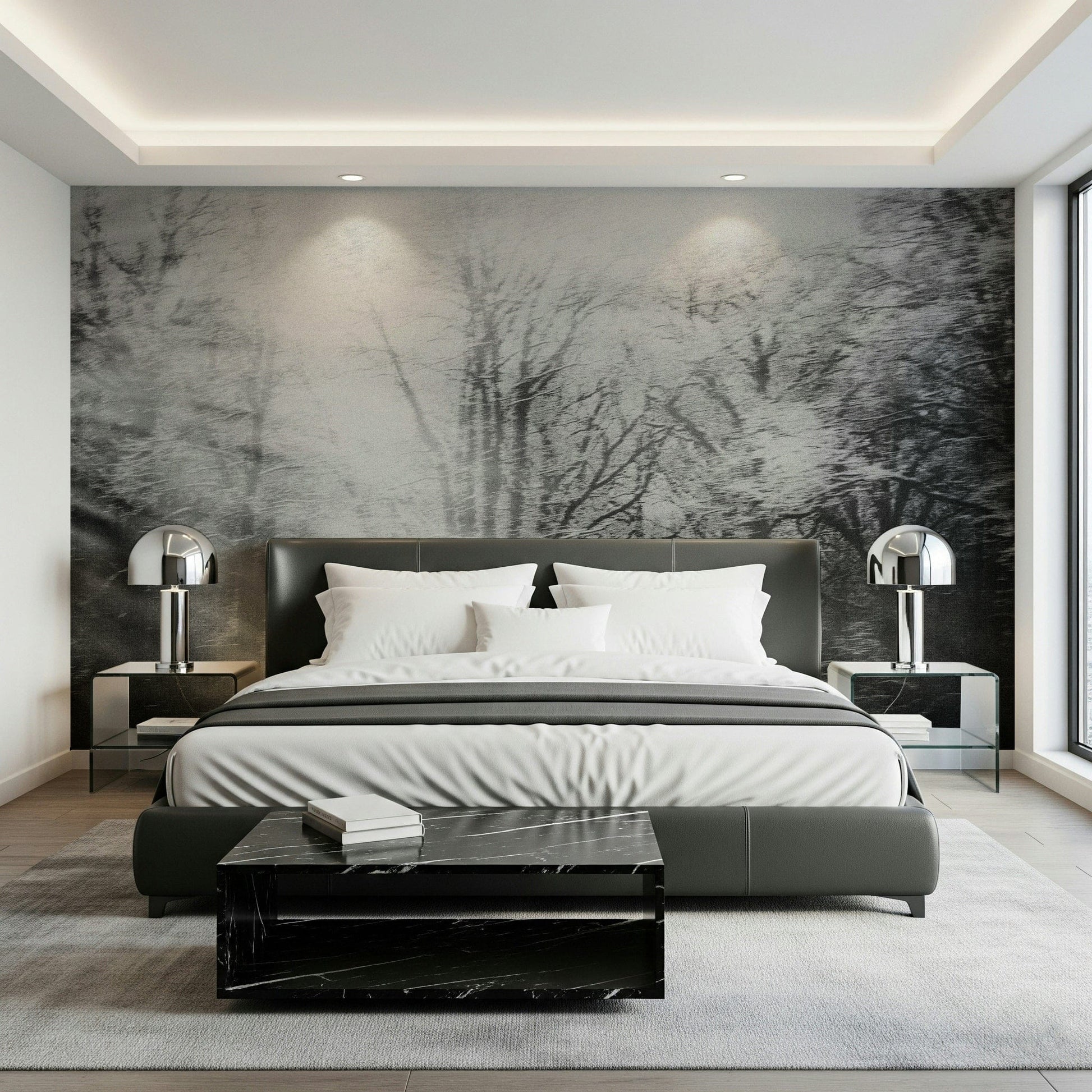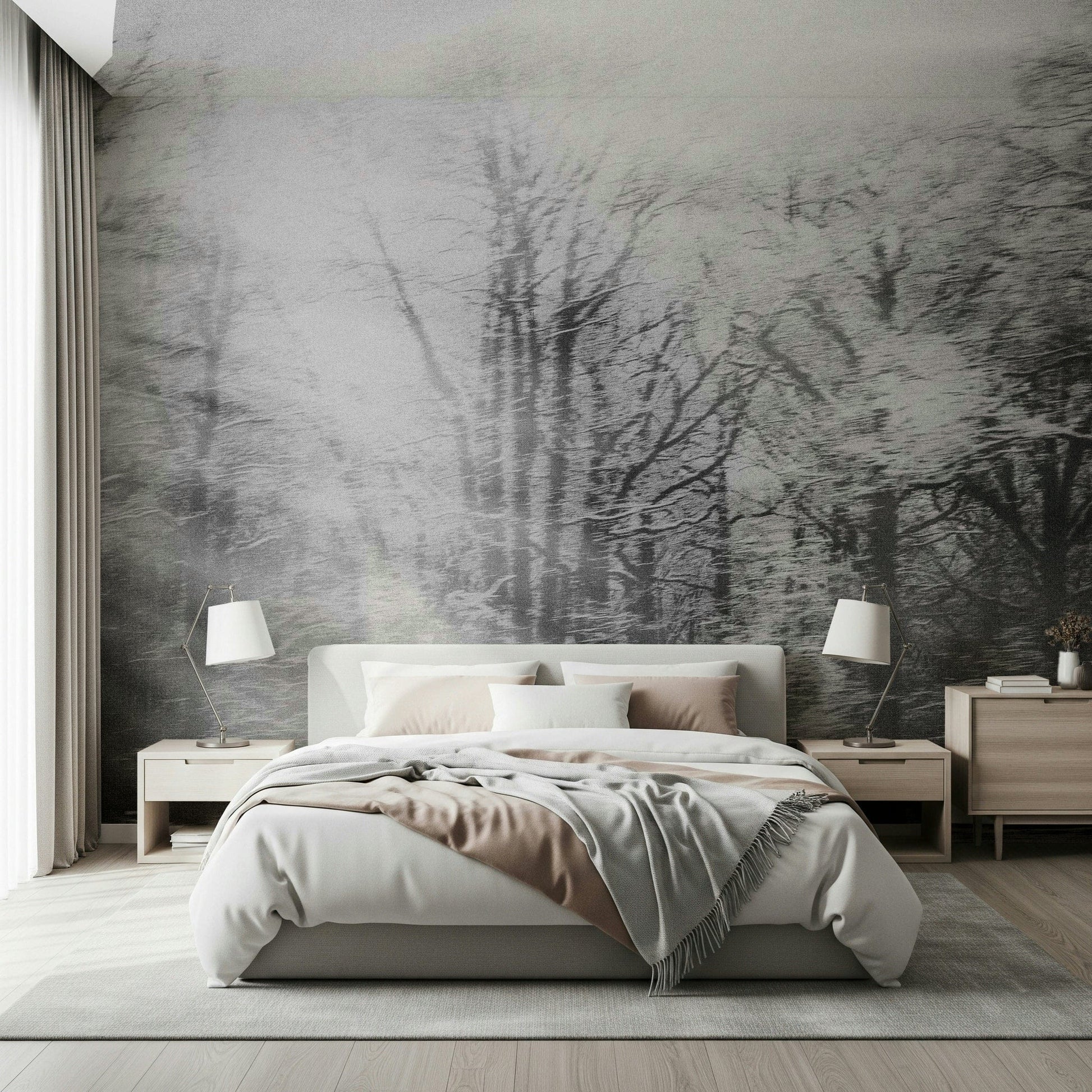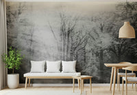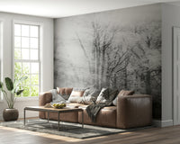 Invite a dreamy ambiance into your home with this grayscale forest image. It presents blurred trees under a diffused light, creating an artistic effect. Consider this stunning wallpaper for walls to make a statement. Ideal for a hallway, living room, or bedroom, this design accentuates modern and minimalist aesthetics. It brings a soothing atmosphere and a hint of abstract nature inside your house, providing a unique wall statement.