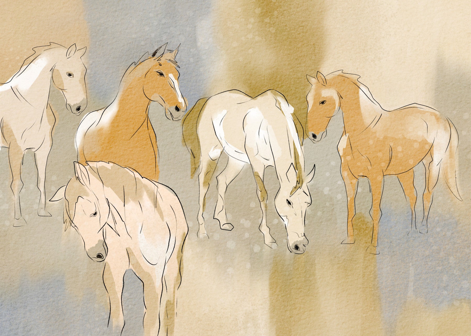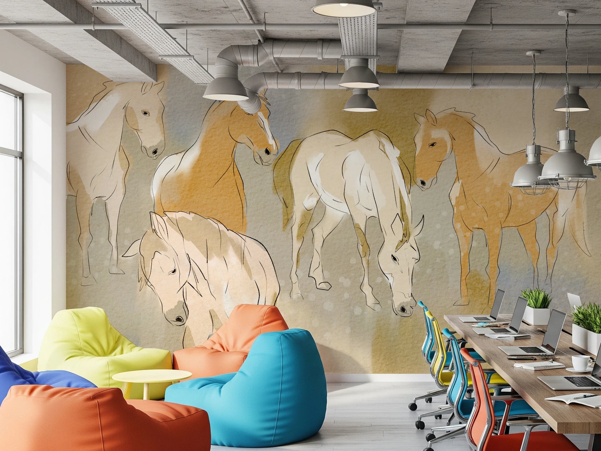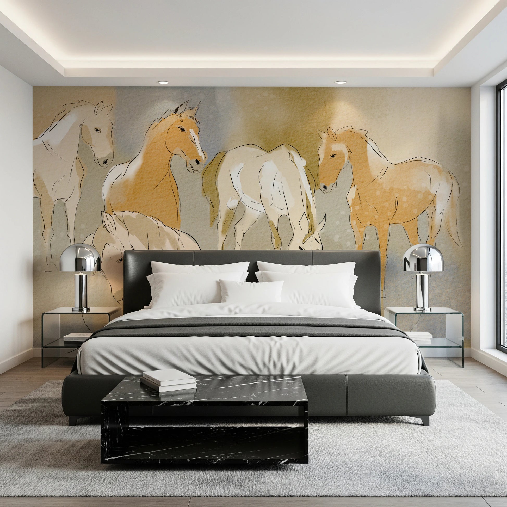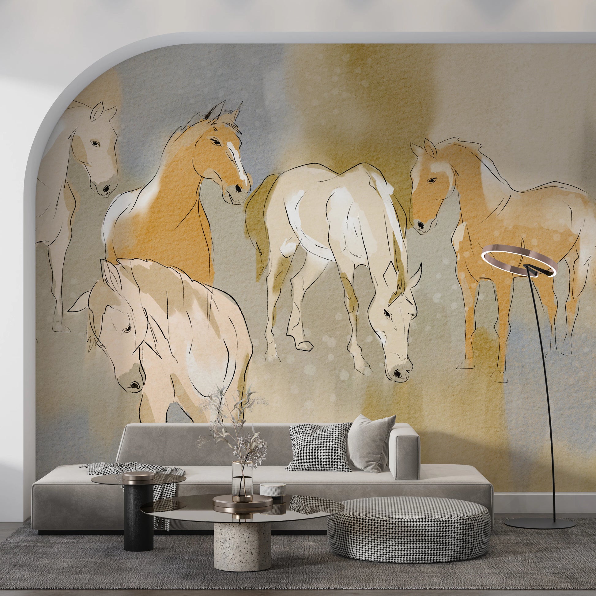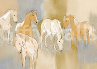 Infuse your space with the serene beauty of 'Equestrian Echoes'. This wallpaper for walls captures the grace of horses in a soft, watercolour style. Earthy tones blend with gentle blues, creating a calming backdrop ideal for living rooms, bedrooms, or studies. The delicate linework adds a touch of sophistication, making it a perfect choice to complement rustic or contemporary decor. Let this design transform any room into a tranquil retreat. The subtle blend of colours enhances the natural light, giving the illusion of a brighter, more airy space.