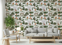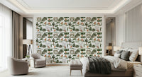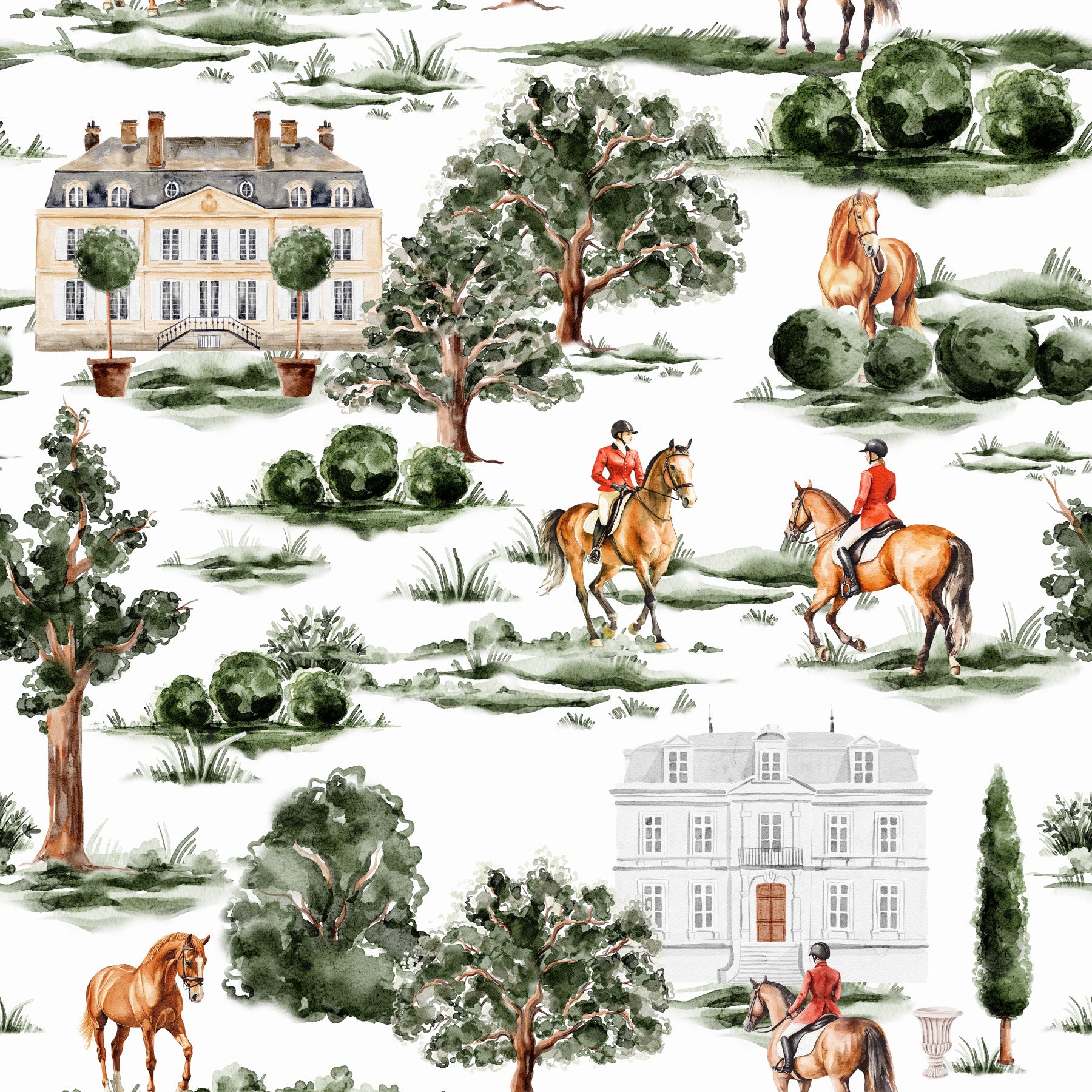 Bring the charm of the countryside indoors with this elegant design by Uta Naumann. This wallpaper for walls features watercolour illustrations of stately homes, lush trees, and riders on horseback, creating a scene that feels both sophisticated and tranquil. The soft greens and warm browns offer a calming palette. Use it in living rooms to add a touch of classic refinement, or in bedrooms for a peaceful, retreat-like ambiance. It complements interiors with a touch of elegance and brings the beauty of an equestrian estate to your home.