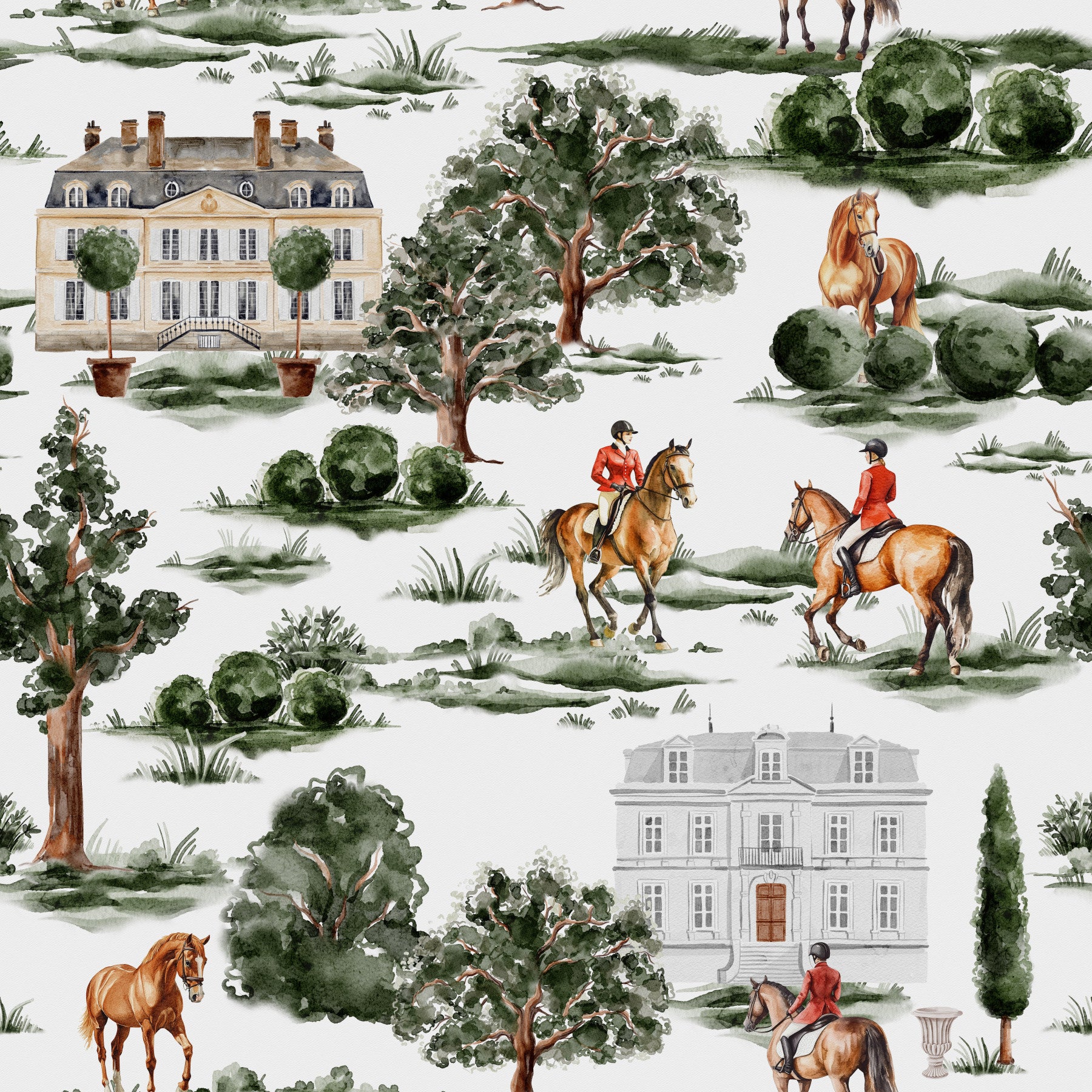 This sophisticated wallpaper design highlights equestrian riders in traditional red jackets, elegant horses, and stately British manor houses set amongst lush countryside greenery. The watercolour style adds depth and vintage refinement, celebrating the traditions of hunting, horse riding, and aristocratic rural life. A perfect choice for interiors seeking timeless luxury and heritage charm, it evokes the atmosphere of English estates and countryside grandeur. Created by Uta Naumann, this design transforms walls into a window of classic elegance and equestrian spirit.
