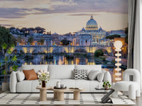 Transform your space with a view of Rome at twilight. This enchanting wallpaper for walls captures the city's iconic architecture bathed in the warm glow of sunset. The design features the Tiber River reflecting the illuminated St Peter's Basilica and the ancient bridges spanning the water. Soft pinks, blues, and golds create a serene and luxurious atmosphere, ideal for a living room, dining room, or bedroom. Let the timeless beauty of Rome infuse your home with history and elegance. This design creates a sophisticated accent, turning any wall into a picturesque escape.
