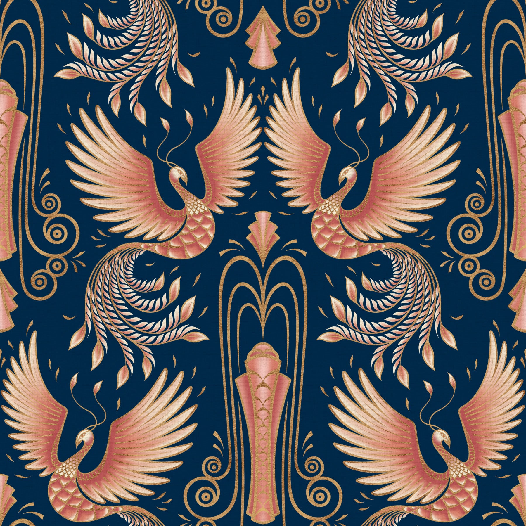 Experience the timeless beauty of the phoenix with this breathtaking wallpaper. The design features majestic phoenixes rendered in soft coral and rose gold hues, their wings spread in an eternal flight. The elegant Art Deco-inspired pattern, with its flowing lines and intricate details, creates a sense of both luxury and movement. The dark navy backdrop enhances the richness of the phoenixes and the metallic accents, adding a touch of mystery and sophistication. This wallpaper is perfect for creating a dramatic and visually captivating atmosphere in any space.