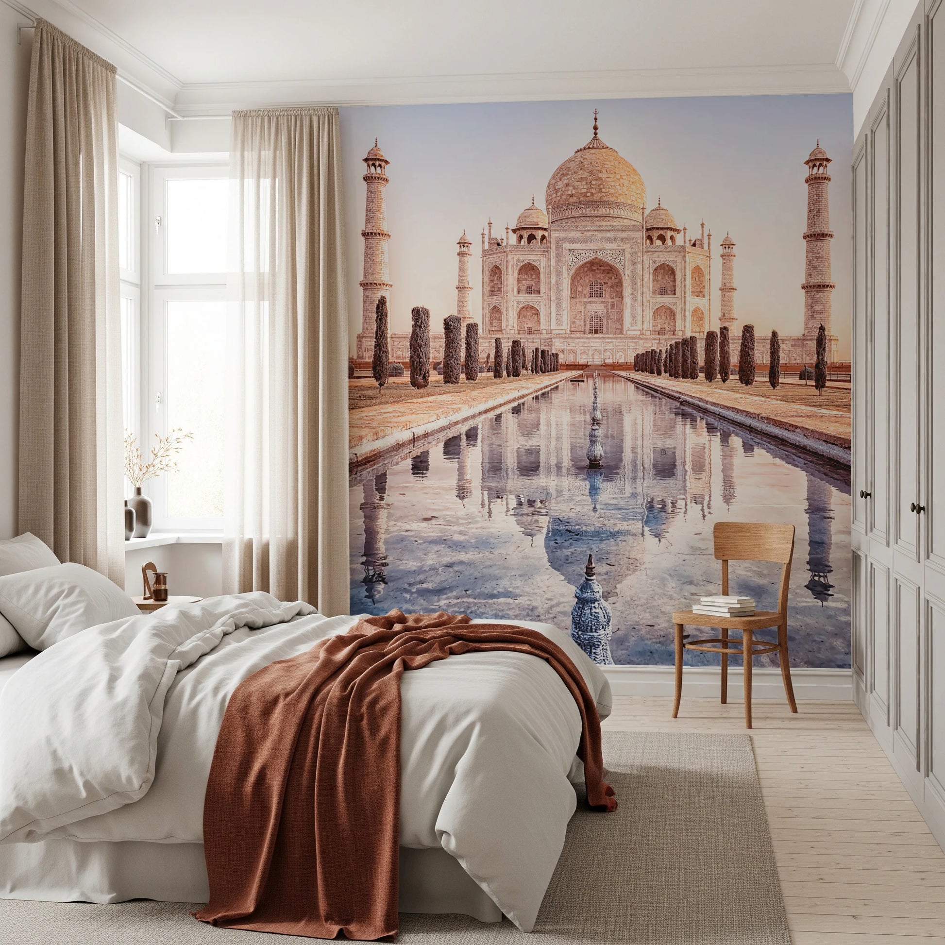 Introduce timeless elegance to your home with this breathtaking image of the Taj Mahal. The serene reflection and soft hues will bring a sense of calm to your interior. Picture this stunning wallpaper for walls transforming your bedroom, creating a peaceful oasis for rest and relaxation. Its intricate details and balanced composition will make a wonderful feature wall. The blue and beige colour palette complements a range of interior designs. The monument's reflection in the water introduces a soothing element. The intricate details create a sense of artistic depth. This wallpaper is ideal for adding sophistication to any room.