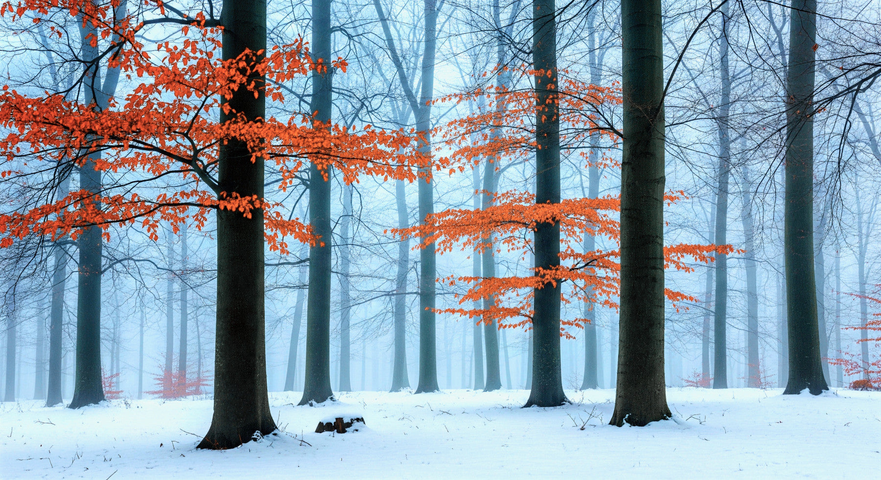Transform your home with this enchanting forest vista. The wallpaper features a snow-covered ground and bare trees shrouded in mist, illuminated by vibrant autumnal leaves. Install this wallpaper for walls to invite the peace of nature indoors. It is suitable for many interiors. Use it to create a serene bedroom retreat, or a calming living room centerpiece. The soft hues and detailed textures bring depth and sophistication to any space.
