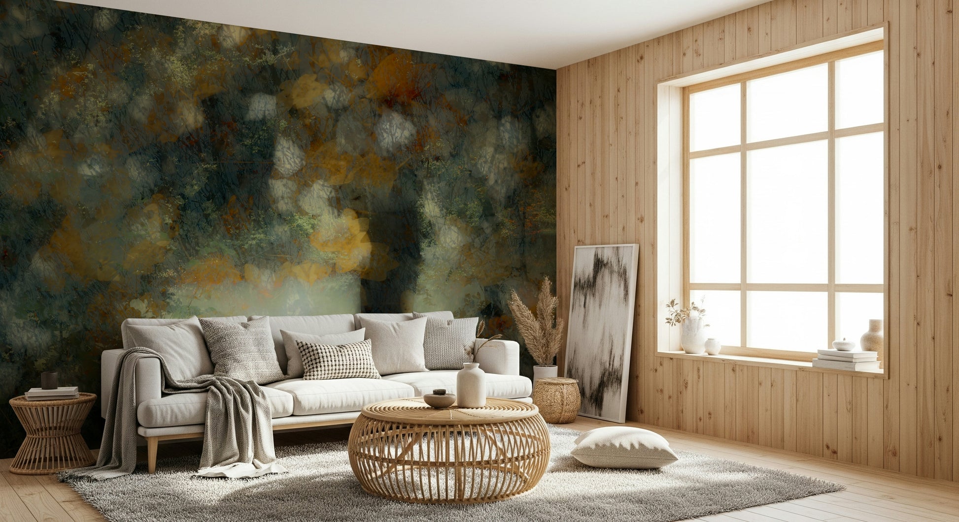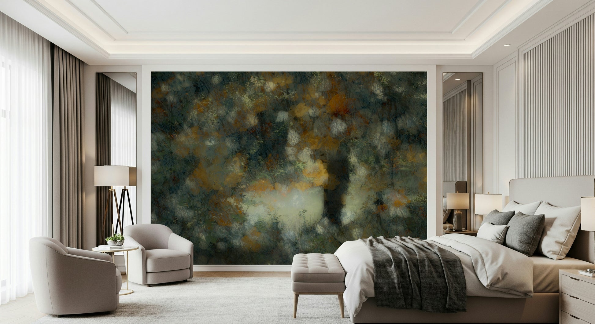 Transform your space with this captivating design, reminiscent of a serene autumn forest shrouded in mist. The artwork blends shades of deep greens, amber and subtle greys, creating an environment of tranquility. The abstract pattern offers a soft, dreamlike effect, ideal for bedrooms or living rooms. This wallpaper for walls brings nature's beauty indoors, lending an artistic touch. It suits minimalist or rustic interiors, enhancing the atmosphere of any space with its elegant and soothing presence.