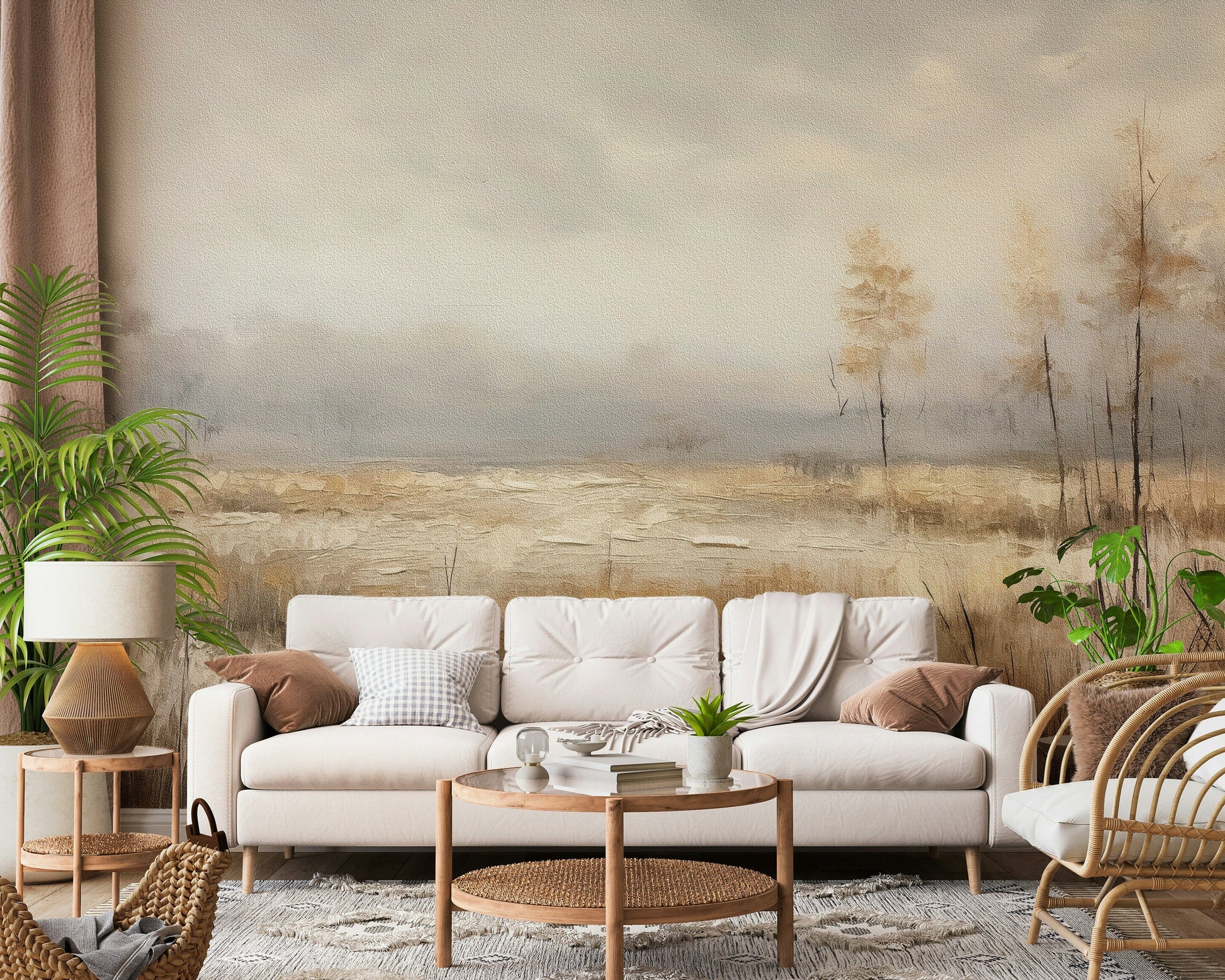 This wallpaper for walls captures the tranquility of an autumnal meadow. The artwork employs a brushstroke style, showcasing the subtle blend of beige, brown, and grey tones. Imagine this adding a serene backdrop to your living room or bedroom. The design complements interiors by adding warmth and organic texture, offering a soft, calming atmosphere that helps to expand the space and create a peaceful environment.